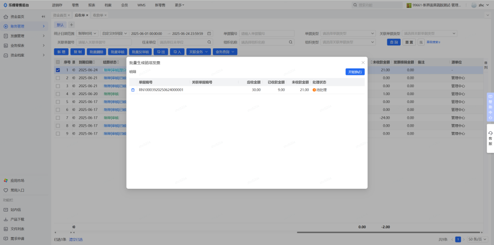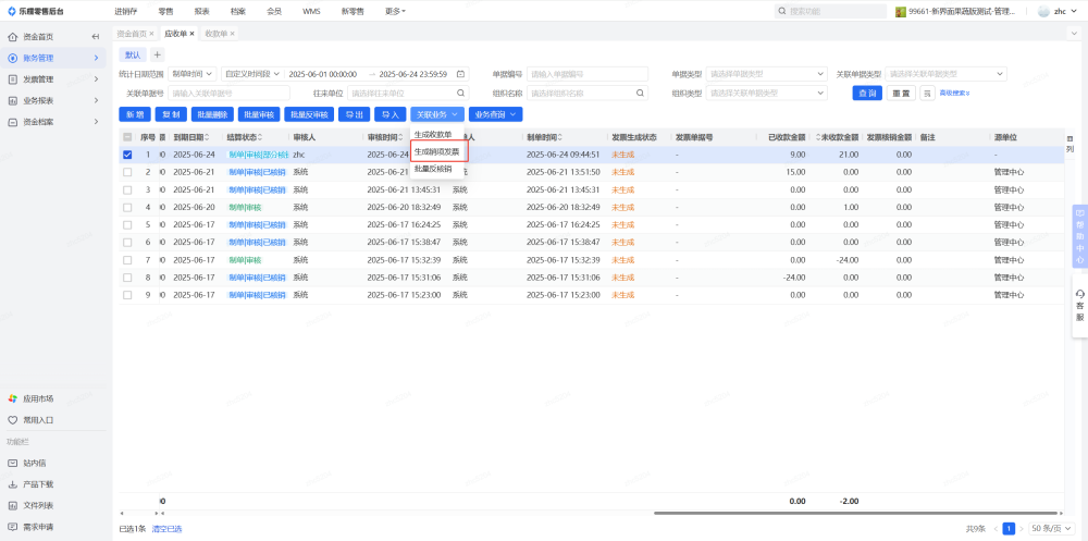 举例:当前有 3 张调出单未生成应收单,通过快速生成应收单手动生成应收单时,如果勾选了参数,则生成 3 张应收单,如果不勾选参数,则生成 1 张应收单,金额为 3 张调出单的汇总金额
