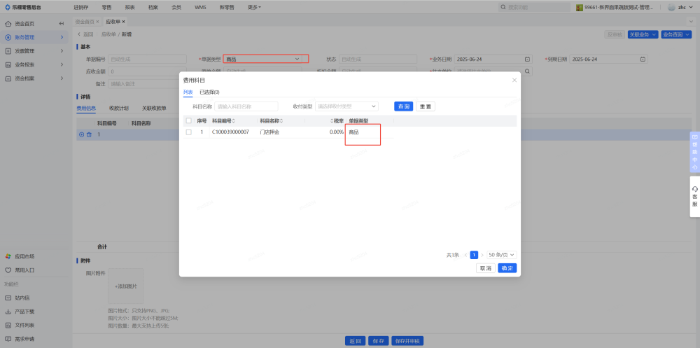 2、单据类型确定应收单的单据类型,如果费用科目选的是商品,生成的应收单就只能是商品的单据类型