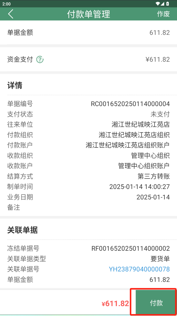 存在收款方 待付款的(储值卡,业务费用,费用)付款单不允许要货:启用时,若该门店有和管理中心或者上级配送中心的(储值卡,业务费用,费用)类型收款单(APP是付款单),则需先付款再要货,否则不能要货