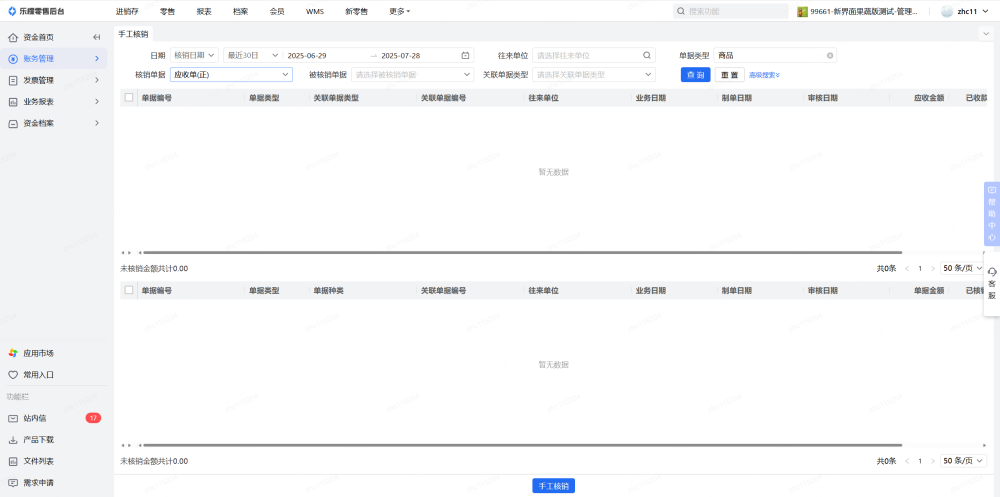 作用:手工核销允许核销关联单据,触发核销后,去除所有勾选单据的关联关系,以适用兼容正常的匹配核销