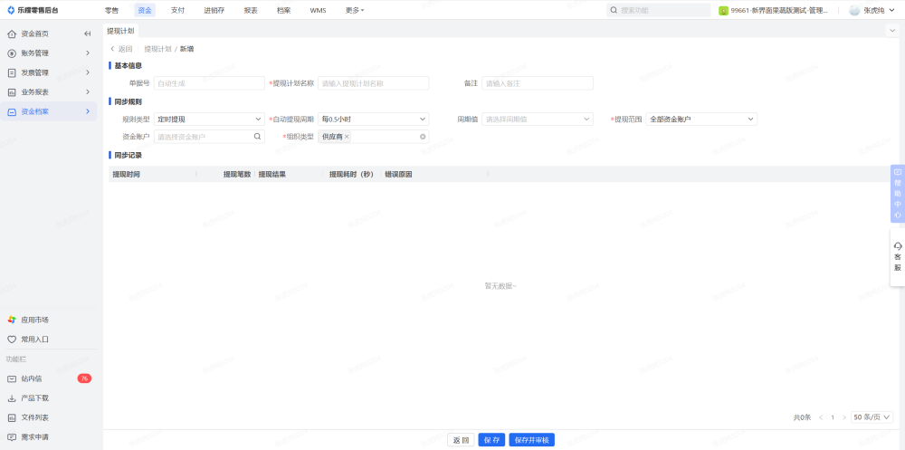 新增界面,可设置自动提现周期,周期值,提现范围,资金账户,组织类型