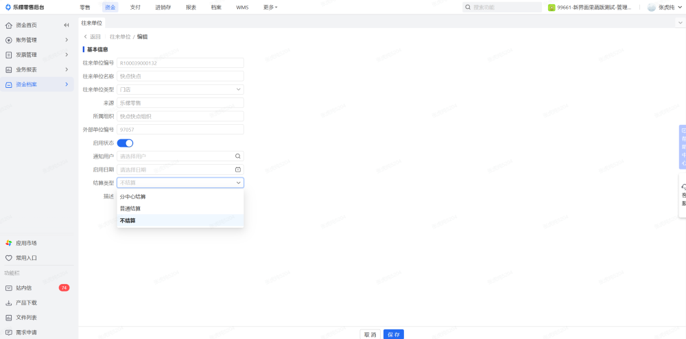 门店类型的往来单位有结算类型,“不结算”、“普通结算”,“分中心结算”