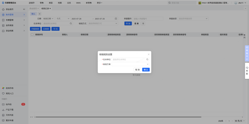 选择对应的往来单位(单选),以及核销方案进行匹配核销,核销范围与核销顺序受核销方案控制
