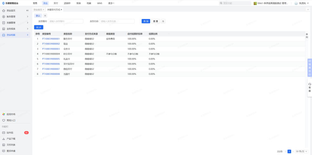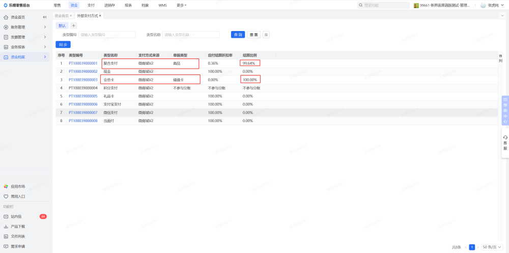 设置:聚合支付的单据类型改成业务费用,结算比例改成 99.64%, 会员卡的单据类型改成储值卡,结算比例 100%。