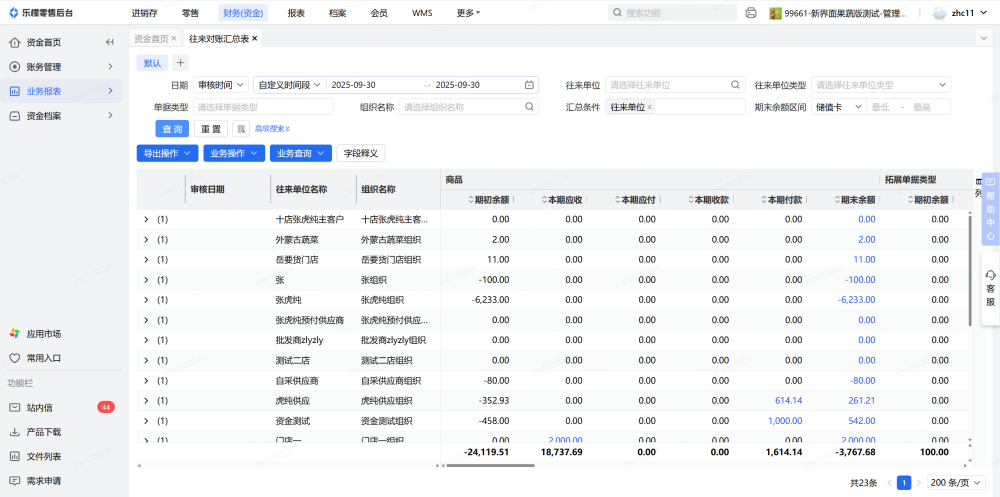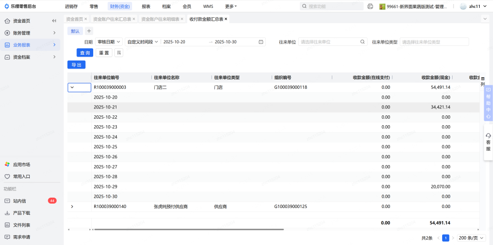 查询往来单位期间各结算方式的收款汇总金额和付款汇总金额,可以按日查询