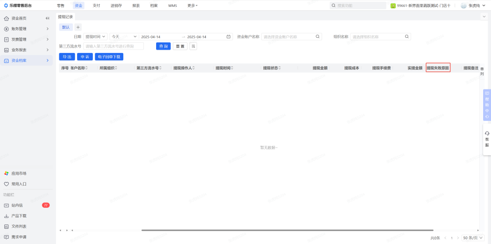 查看所有的乐檬系统发起的提现记录状态,失败的会有显示失败原因。也可以下载提现回单