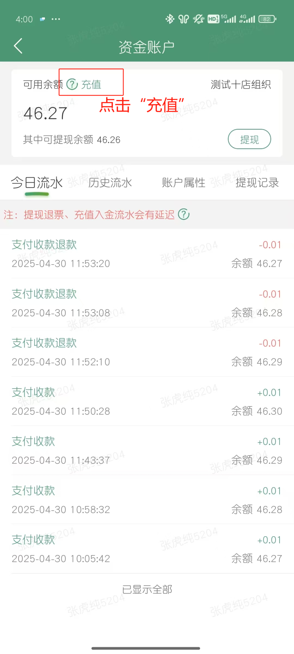 余额(图中0.4位置所显示):当前门店虚拟账户内余额,可以点进进入提现
