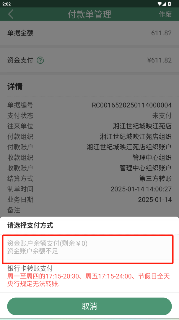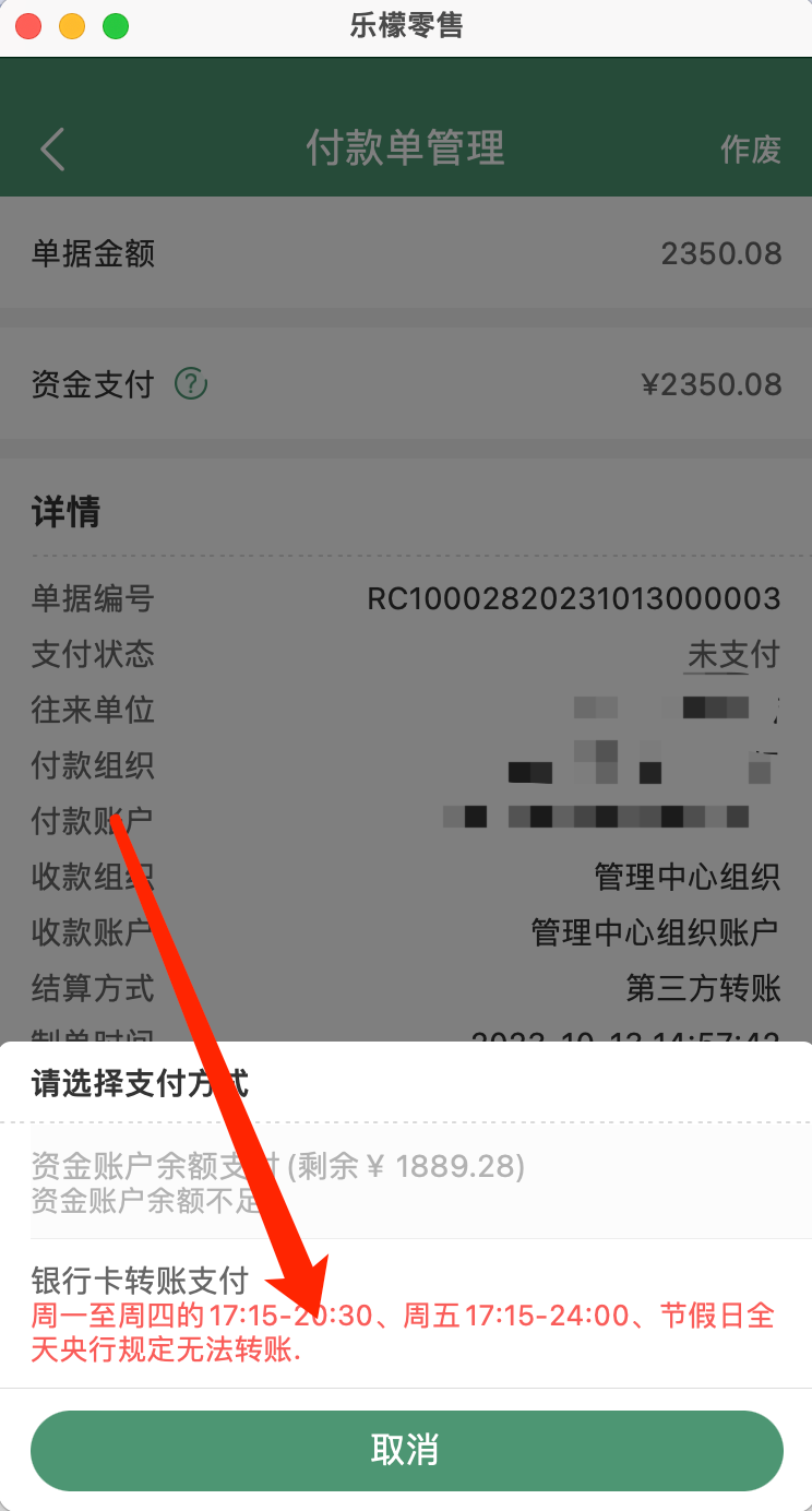 点击资金账户余额支付,余额不足先进行充值,然后再进入资金-付款单管理,点击对应付款再次进行付款。