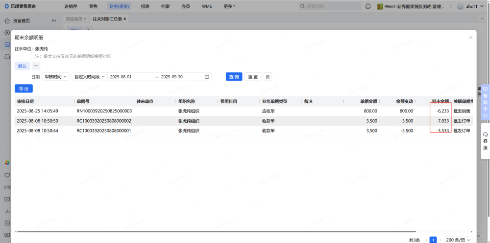 点击期末余额可以查看明细数据,可以查询到每条明细后的交易后余额