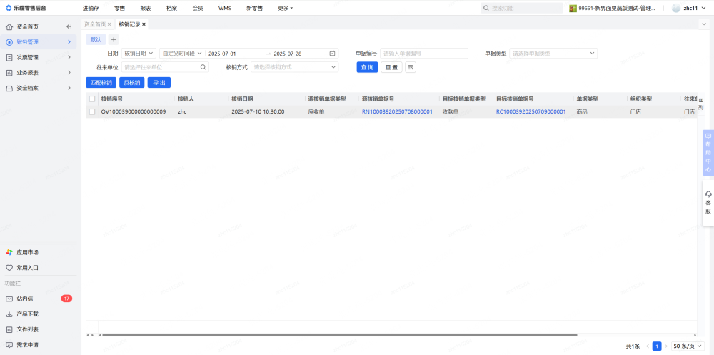 作用:可以查询单据核销记录,可以进行匹配核销和反核销