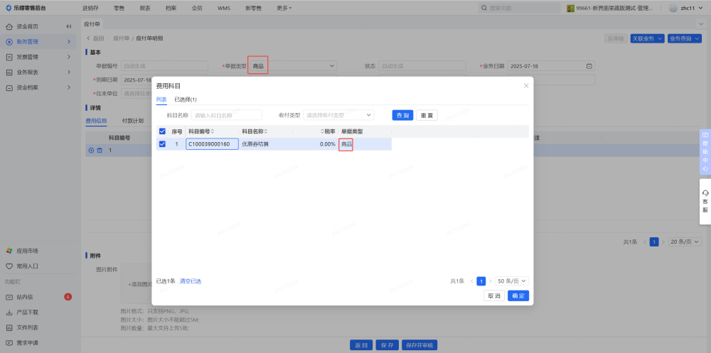 4、佣金收益单生成应付单单据类型“商品,储值卡,业务费用,费用,拓展单据类型 1,拓展单据类型 2”