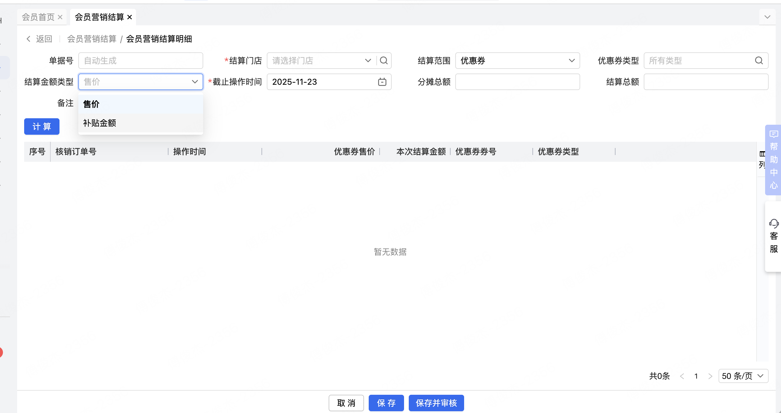 全渠道会员-优惠券结算页面,新增了「结算金额类型」参数,可通过选择优惠券售价/优惠券补贴金额分别进行结算时的金额计算