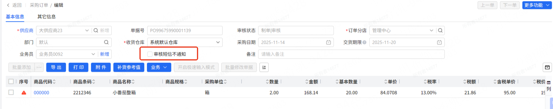 采购模块短信通知设置采购订单审核通知供应商,这个是全部会通知,但是有些采购单是不需要通知供应商的,如:平账之类的采购订单,需要在采购订单加个选择项,单据是否短信提醒