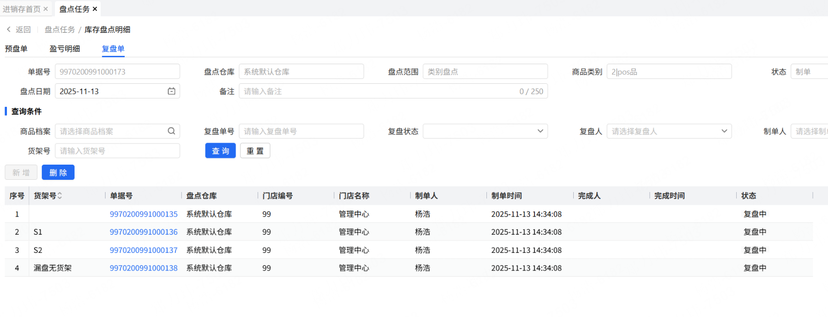 按钮“生成复盘单”,按相同的货架合并商品,即一个货架号生成一个复盘单