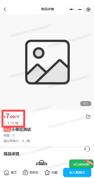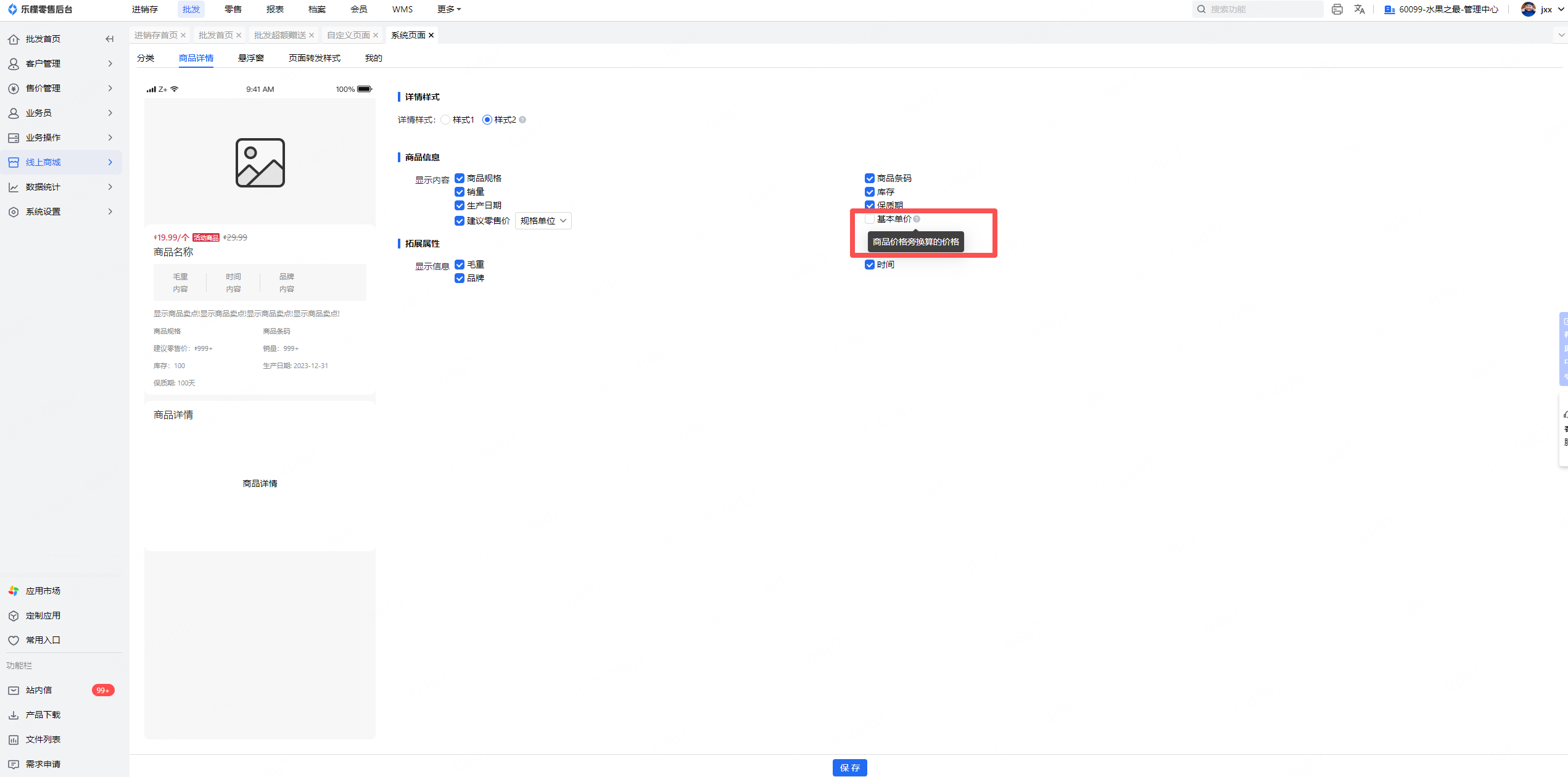 1、系统页面-商品详情-商品信息:新增一个选项“基本单价”,默认勾选;勾选后小程序商品详情中会显示“=xx/单位”,未勾选则不展示