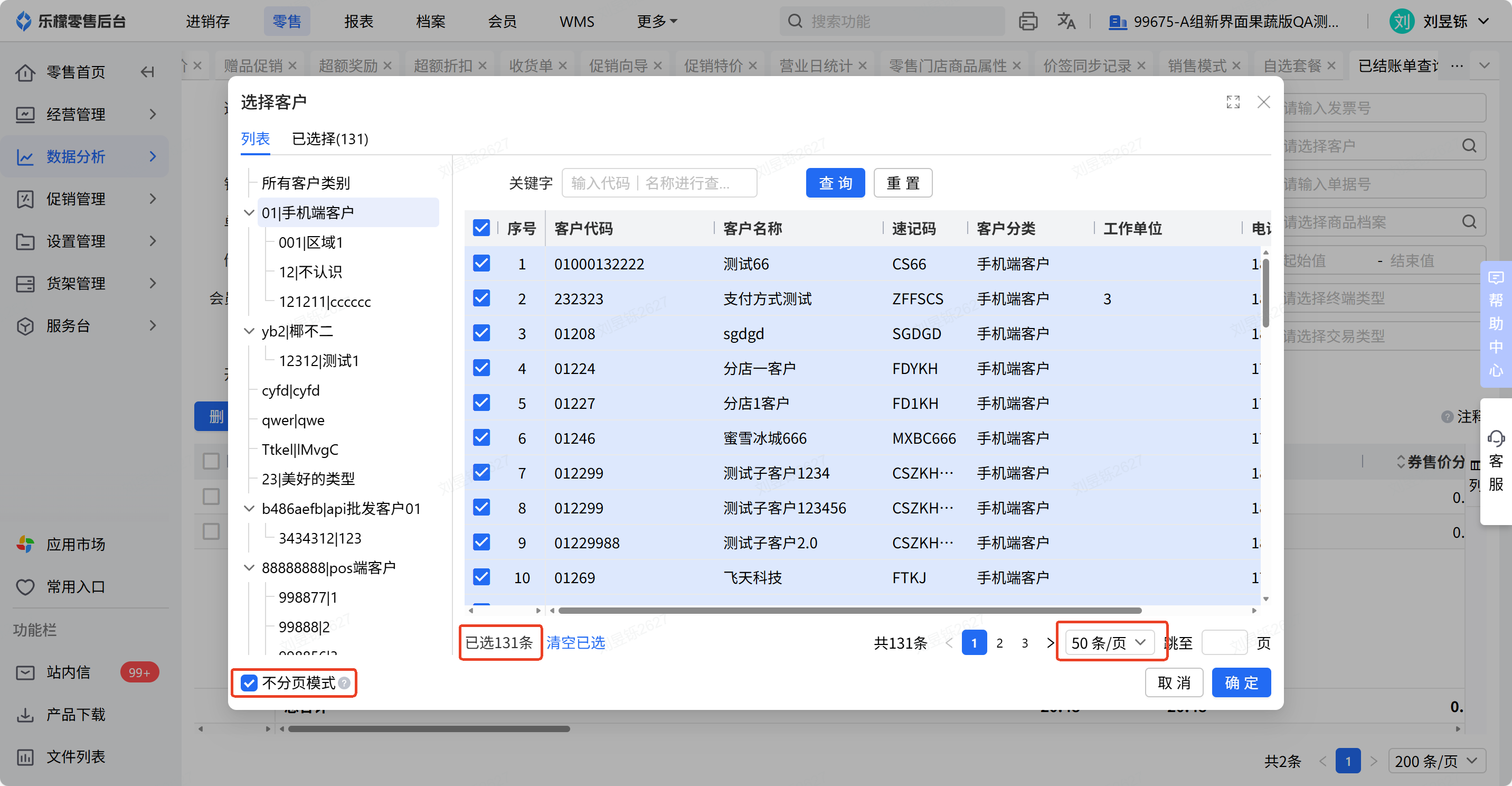 零售侧批发客户选择弹窗,新增【不分页模式】勾选框以及【全选】按钮,勾选不分页模式后全选按钮可点击;不分页模式勾选可保存在浏览器缓存;点击全选时勾选当前类别下所有信息项目,切换类别点击时覆盖当前已选