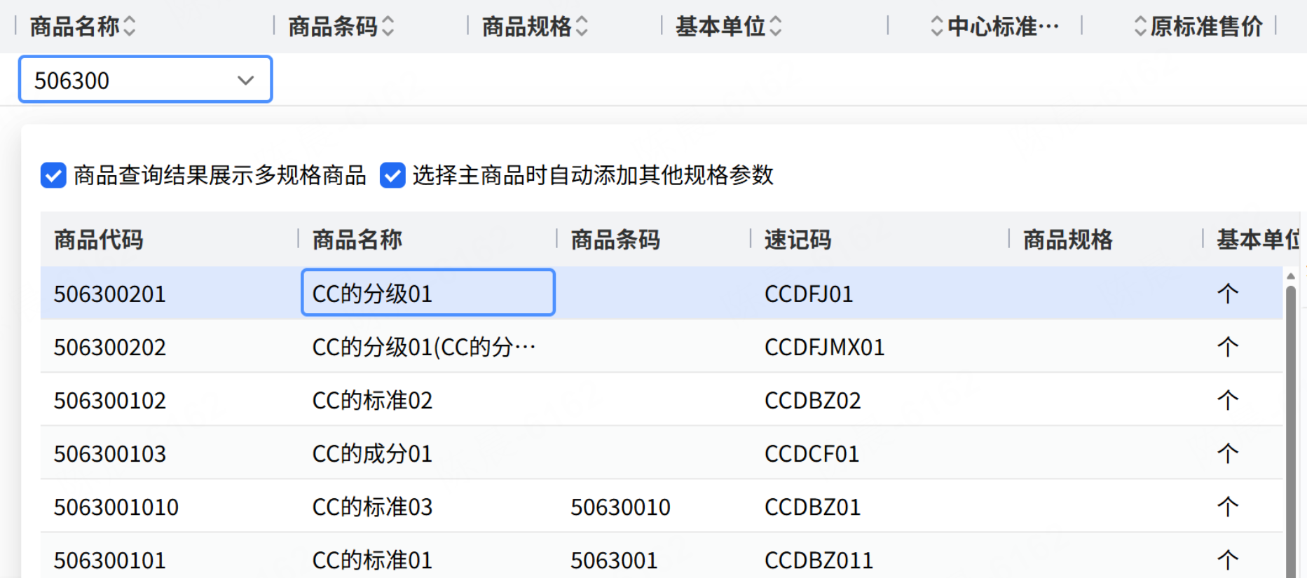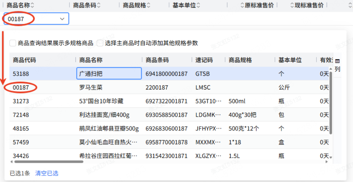 关键字输入添加商品的查询结果展示弹窗,按照名称完成全匹配-速记码长度升序-编码升序的次序排列。本身输入框支持商品名称/代码/条码/速记码,与上述逻辑并不相符