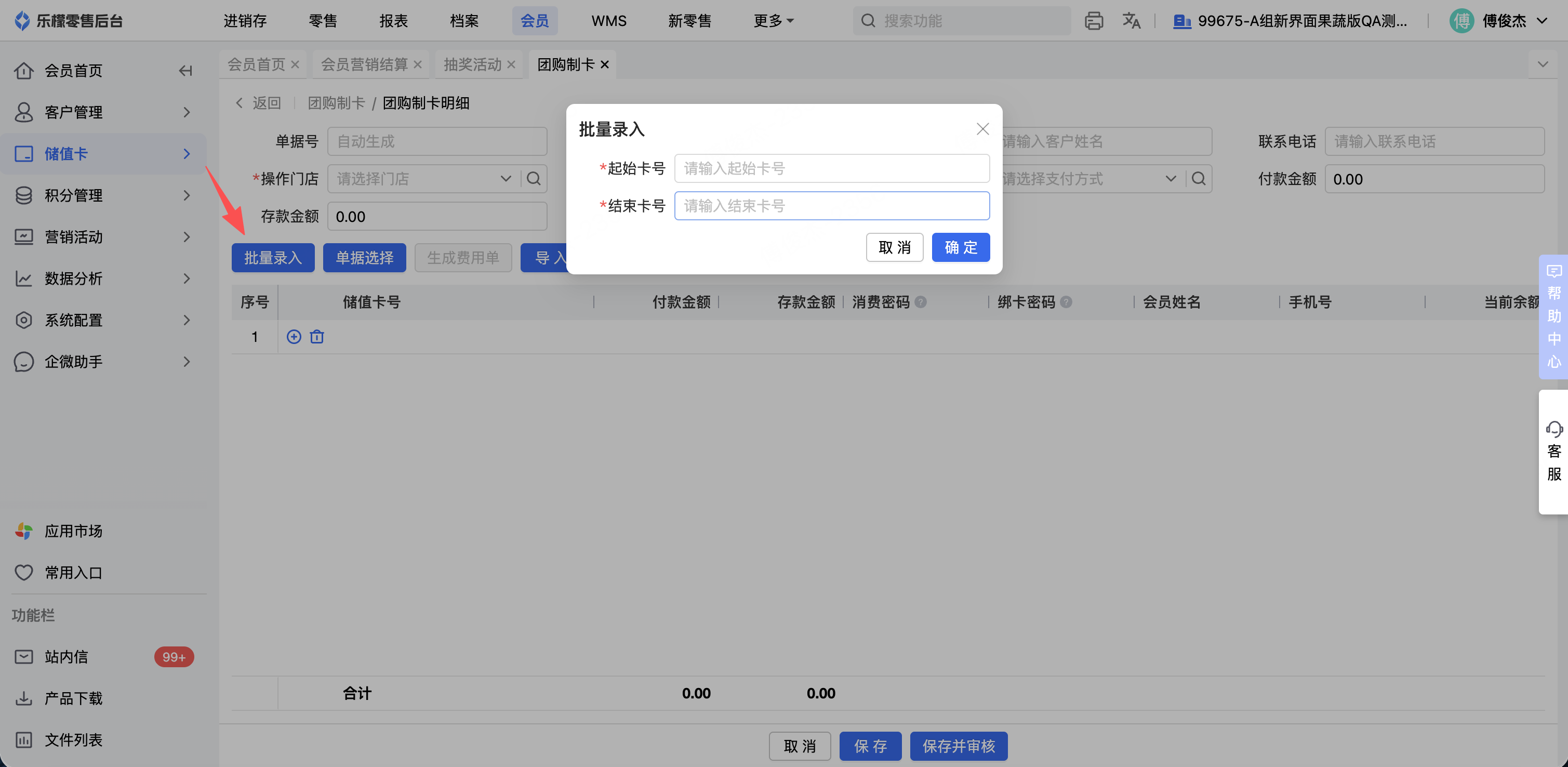 1、全渠道会员-团购制卡-团购储值,新增按钮「批量录入」,点击后允许输入起始/结束卡号进行卡号录入,并操作团购储值