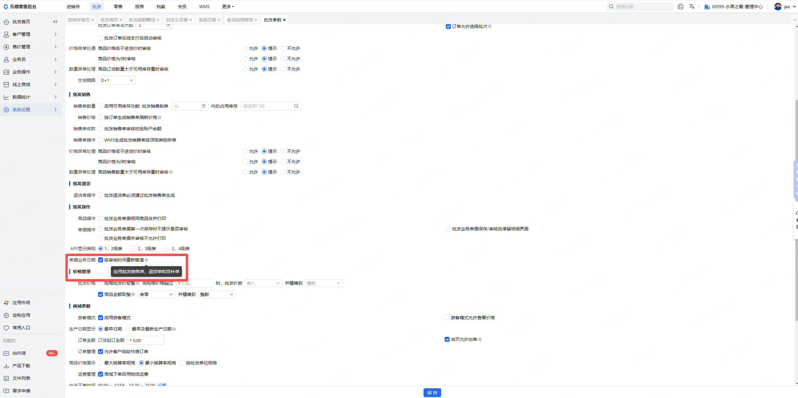 1、批发参数新增一个参数 “单据业务日期”,默认不勾选;勾选后业务日期按审核时间赋值