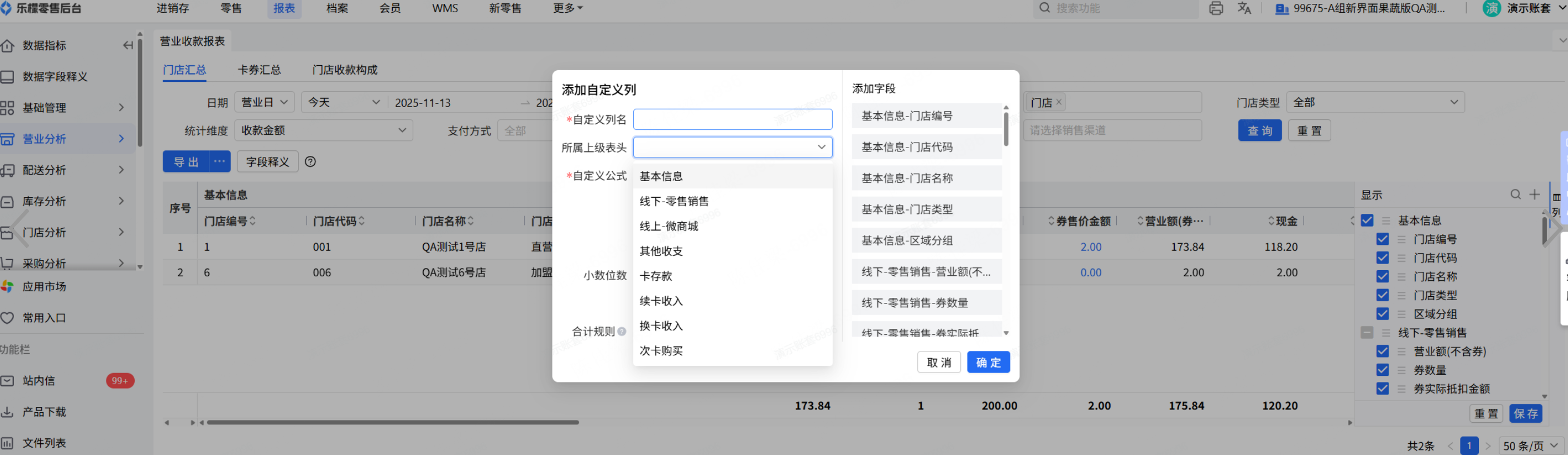 乐檬报表 - 营业收款报表V2支持自定义列选择所属上级表头