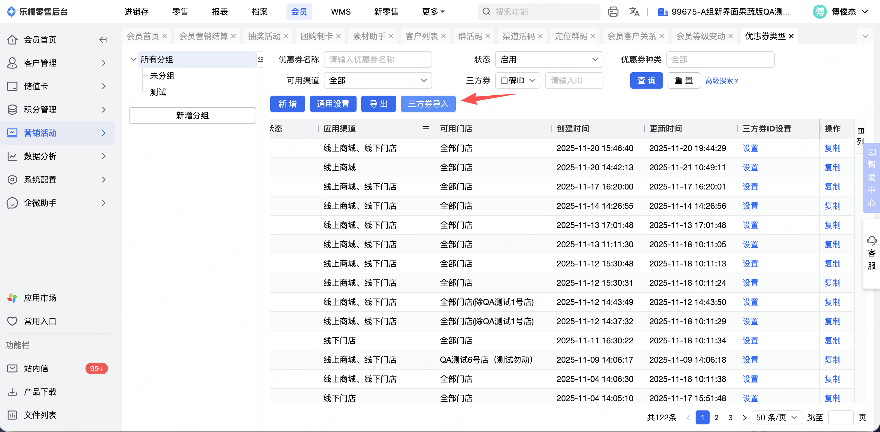 1、全渠道会员-优惠券类型,新增「三方券导入」功能,点击后允许上传文件针对已有券类型进行批量导入三方券id,实现快速绑定三方团购券和乐檬券类型的效果