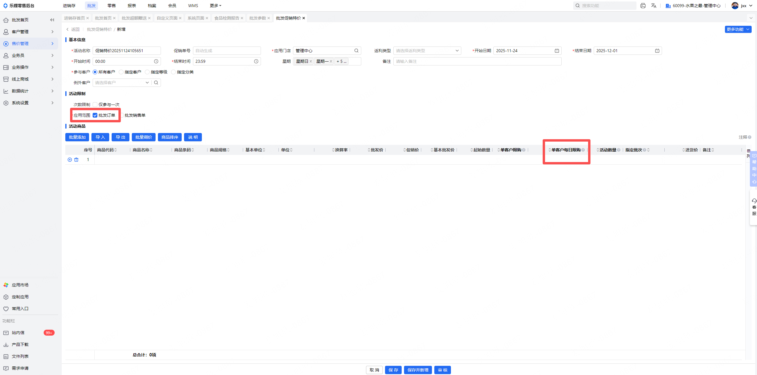 1、批发促销特价新增页面-应用范围只选择批发订单时:添加商品列表新增一列“单客户每日限购”(单客户每日限购数量,应用小程序、app、web),默认为0(0代表不限制,单客户每日限购不能大于限购数量和活动数量,超出每日限购后恢复原价,计算限购数量以订单审核数量为准)