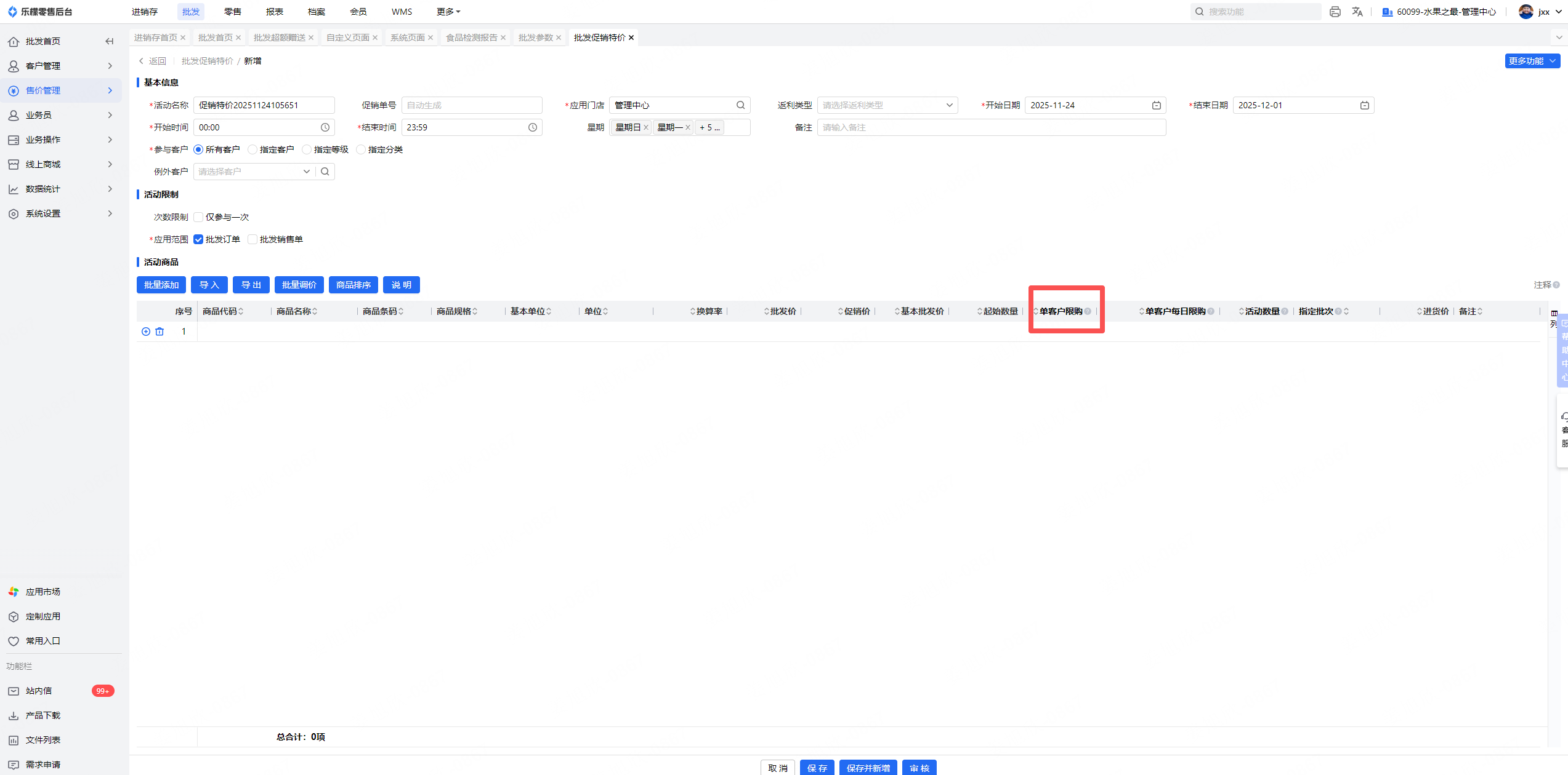 3、批发促销特价新增页面-商品列表“限购数量”改为“单客户限购”