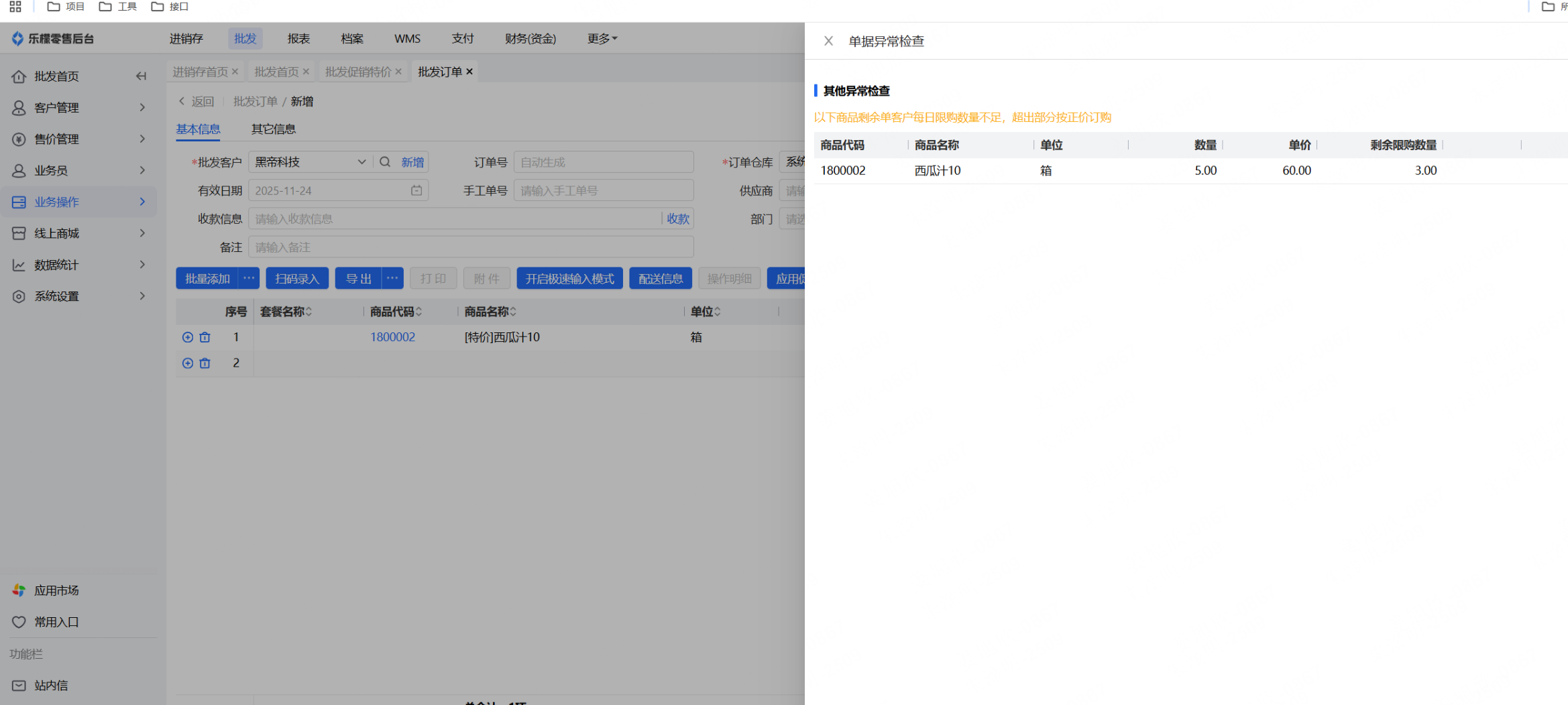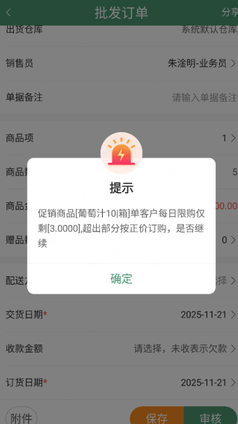 2、下批发订单时展示一行商品;审核的时候需校验该客户该商品的每日限购,超出限购数量的促销商品审核后展示两行商品数据,一行为促销价的最大限购商品,一行为超出限购的正常价格商品;未超出限购数量只展示一行促销价的商品;订单审核时超出限购提示“促销商品XXX限购数量仅剩X个,超出部分以原价计算”