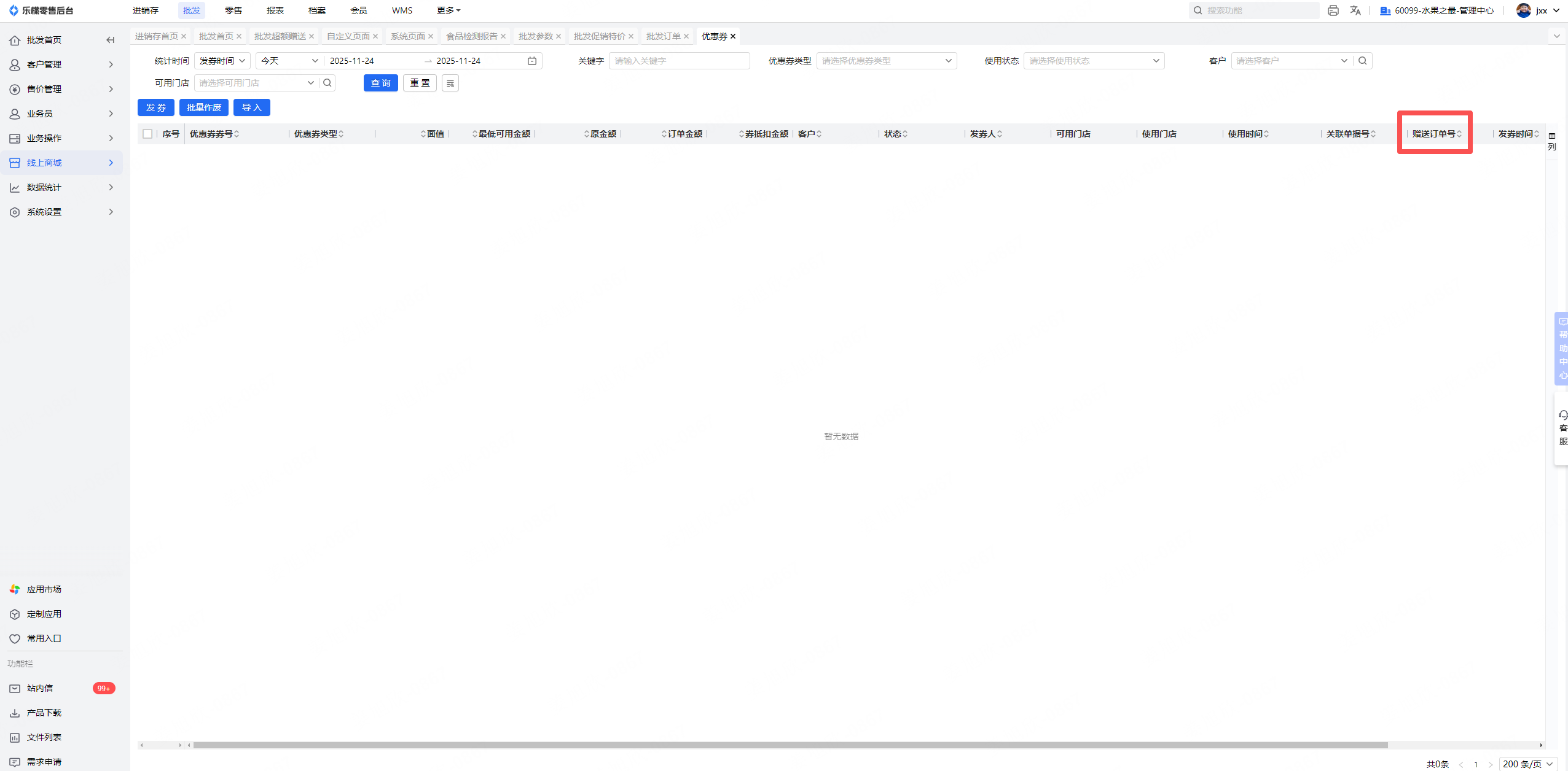 若批发订单作废,那么对应赠送的优惠券也要自动作废(若券设置了赠送数量,需重新计算, 客户券有数量限制的 如果作废了要把这个数量还给客户),若优惠券已使用则无法作废