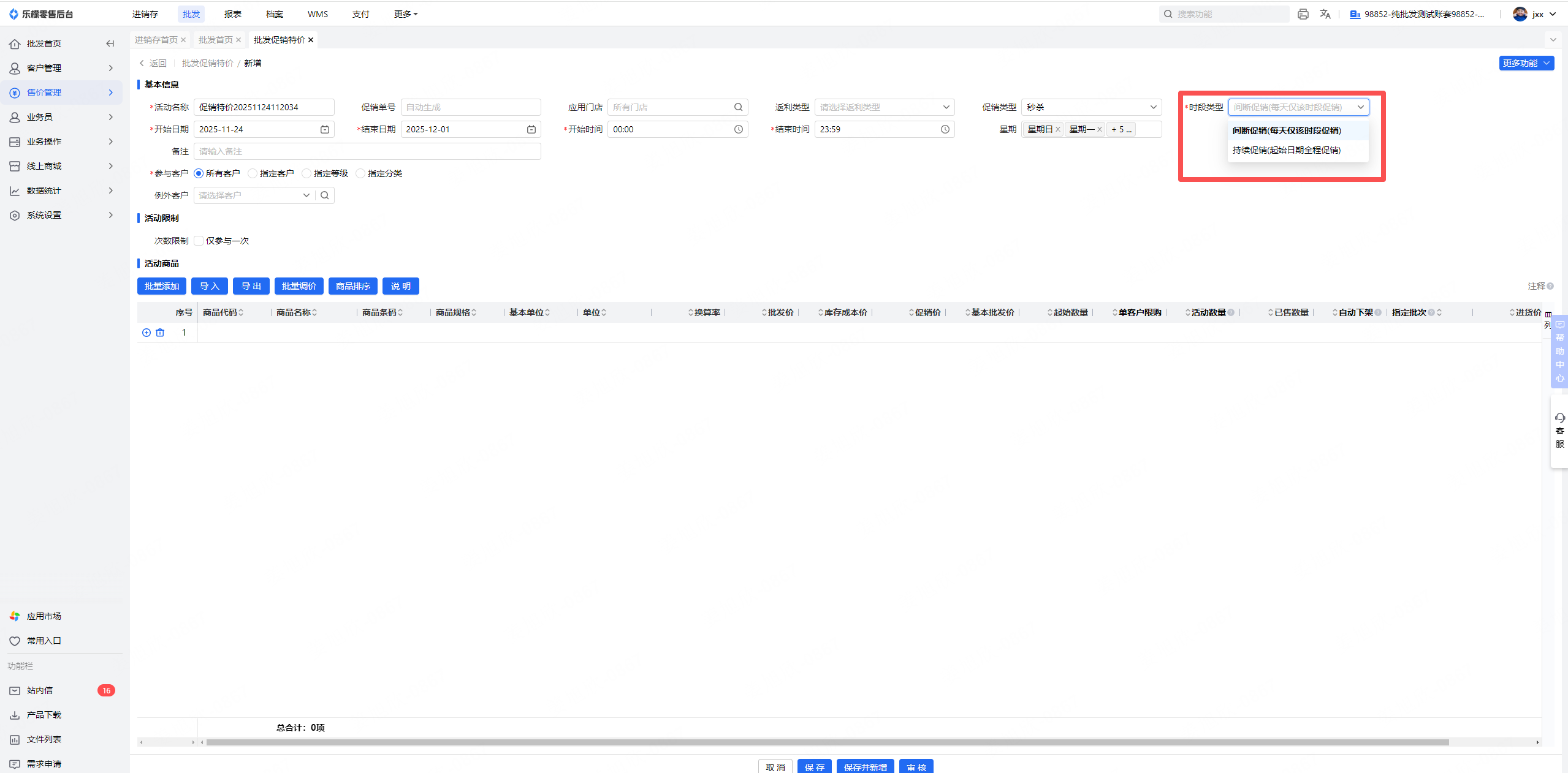 功能路径:WEB-批发-售价管理-批发促销特价
