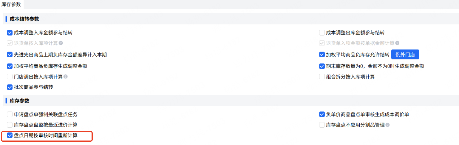 库存参数,增加参数“盘点日期按审核时间重新计算”,默认不勾选