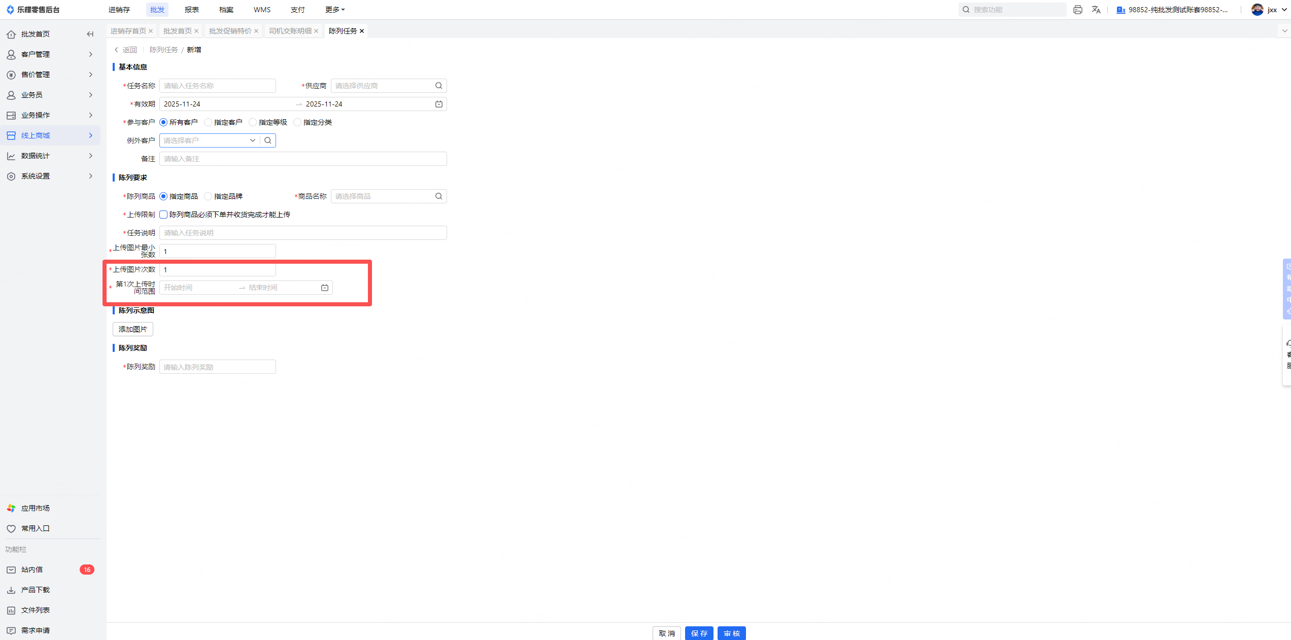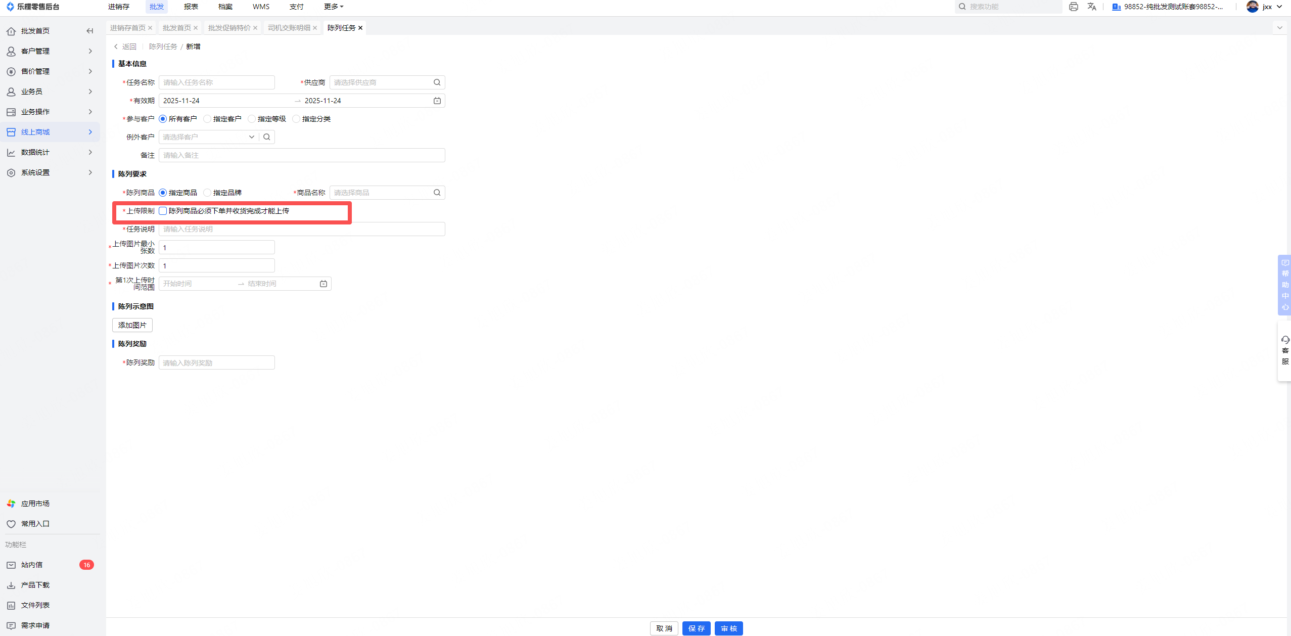 1、陈列任务详情页面新增一个“上传限制”(选指定商品才会有),默认不勾选,勾选后该陈列任务领取后自动将陈列商品(分类默认显示的规格)加入购物车,数量为1;且提交陈列任务时需判断每个陈列商品是否已经收货完成(任何规格都可)