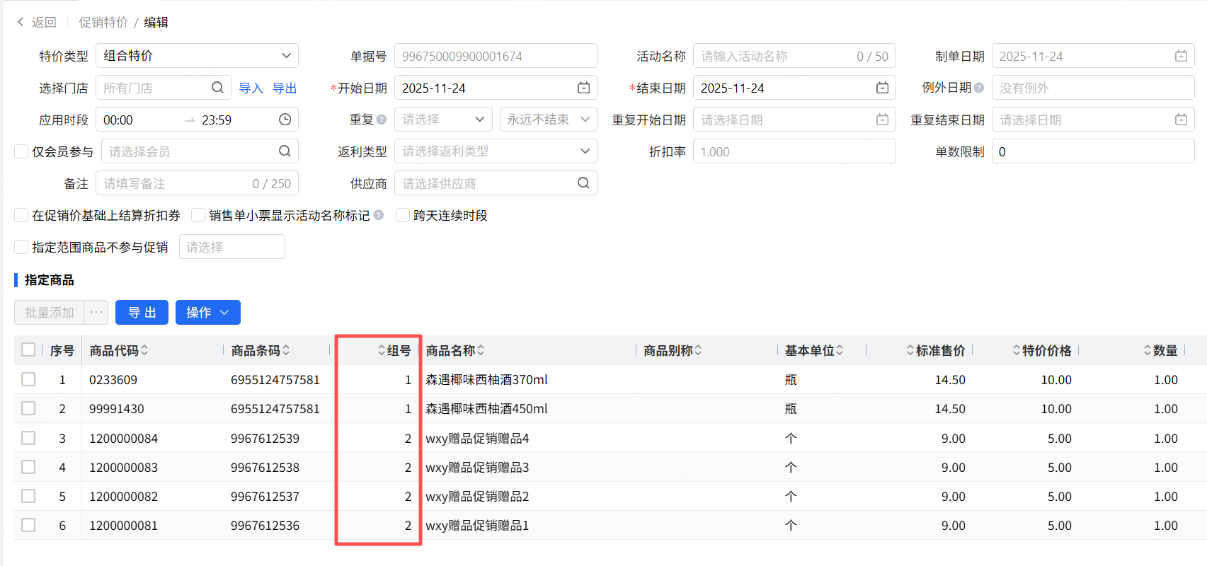 将所需要分组做活动的商品进行组号的设置,允许为空,不可输入0