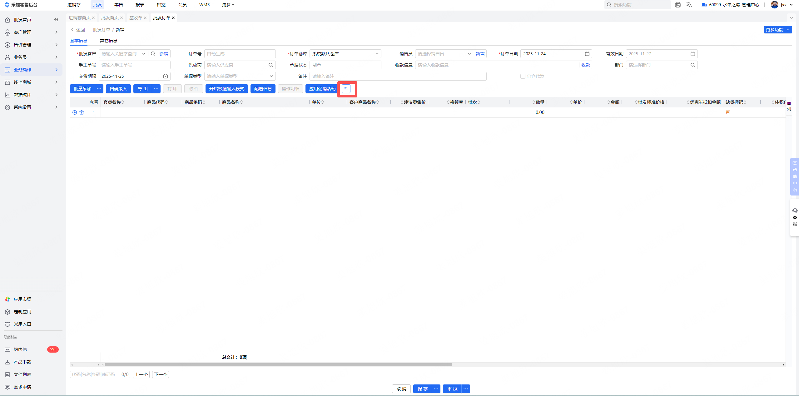 1、批发订单/批发销售单/批发退货单/售后申请/销售开单详情页面操作旁增加一个“缩放按钮”,点击隐藏表头信息,再次点击展开表头;