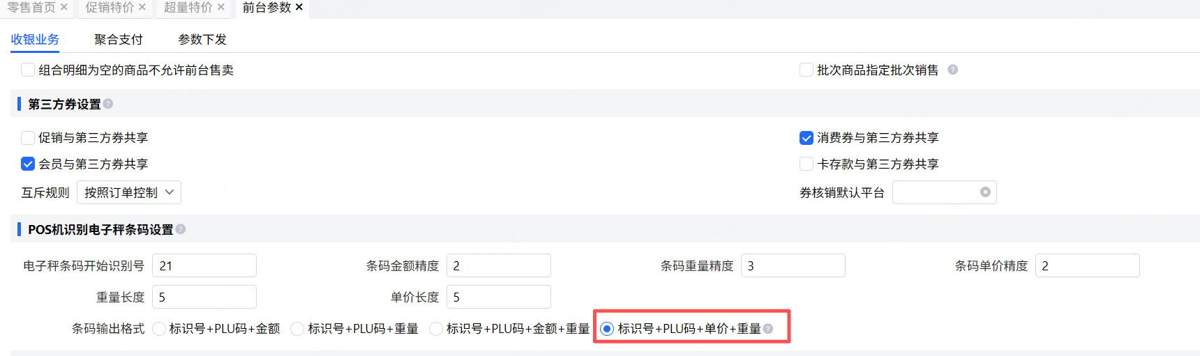 新增条码秤输出格式类型【标识号+PLU码+单价+重量】,新增数字选择框【条码单价精度】【单价长度】