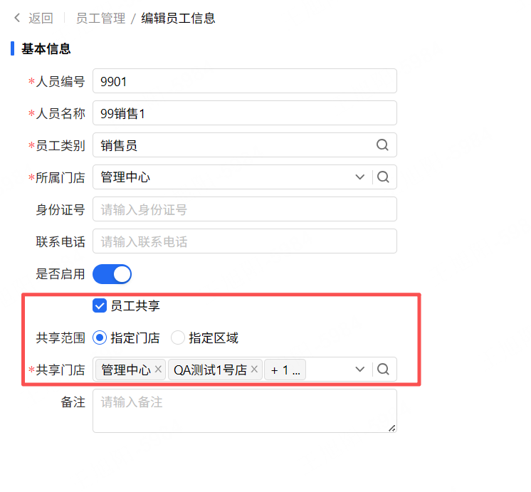 商家销售员可能会属于多家门店,去不同门店去进行推广等业务,需要将销售员的提成数据记录到同一个人,现有的销售员按门店区分,若满足上述场景则需要分开门店设置,操作繁琐,导致数据查询不便捷;需求可设置销售员按门店共享