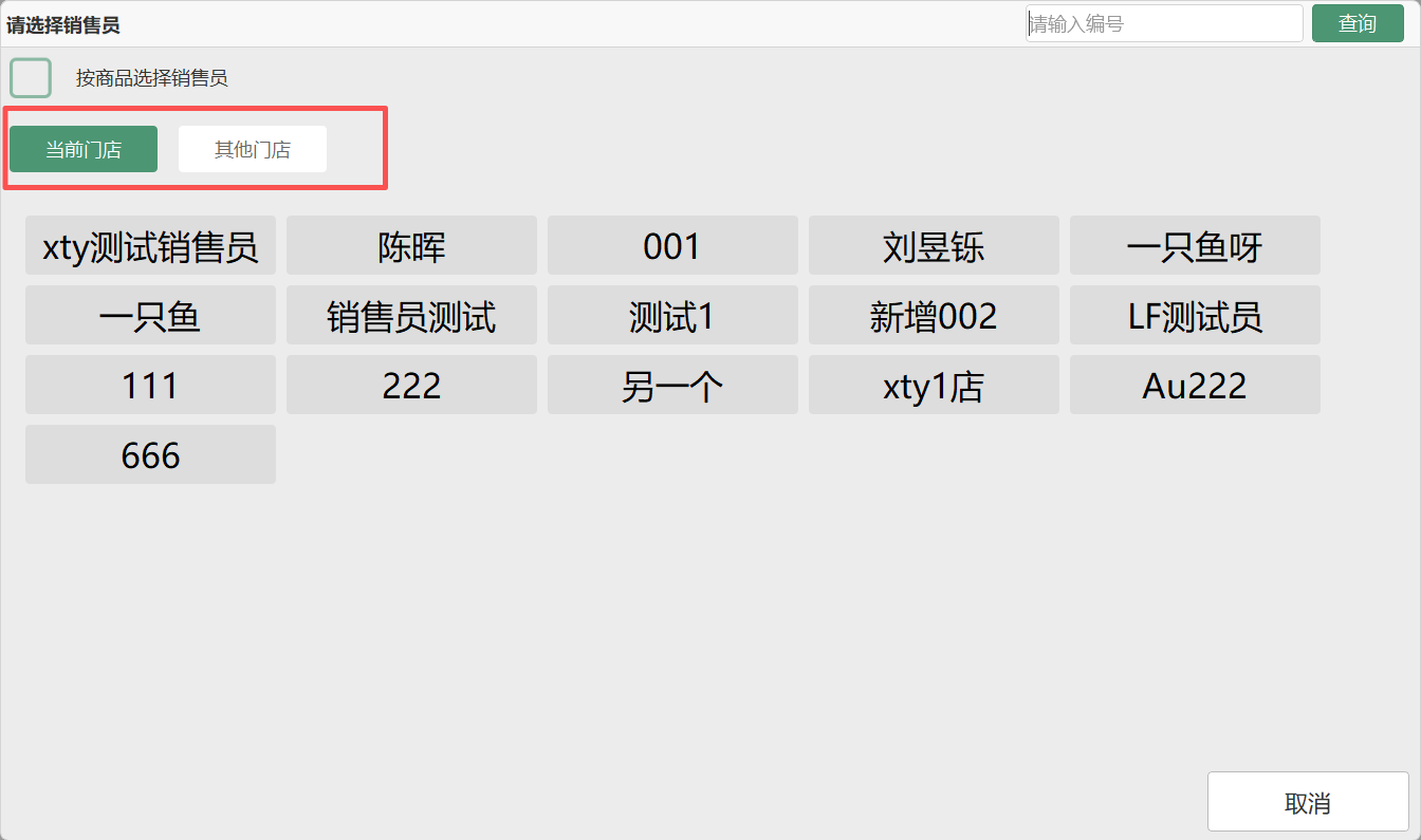 前台获取销售员列表时,判断该销售员是否共享在当前门店显示,若存在,则显示在销售员列表,并支持搜索