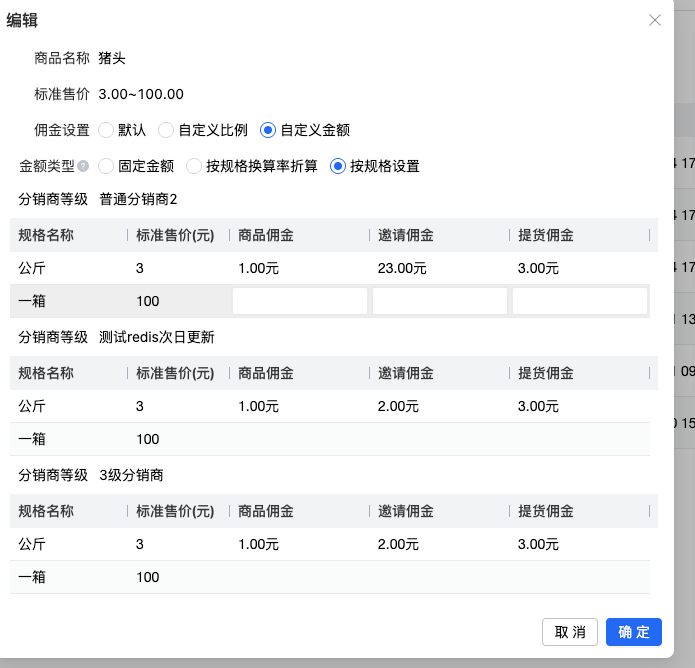 分销商品的商品佣金,选择自定义金额时,支持按规格设置佣金