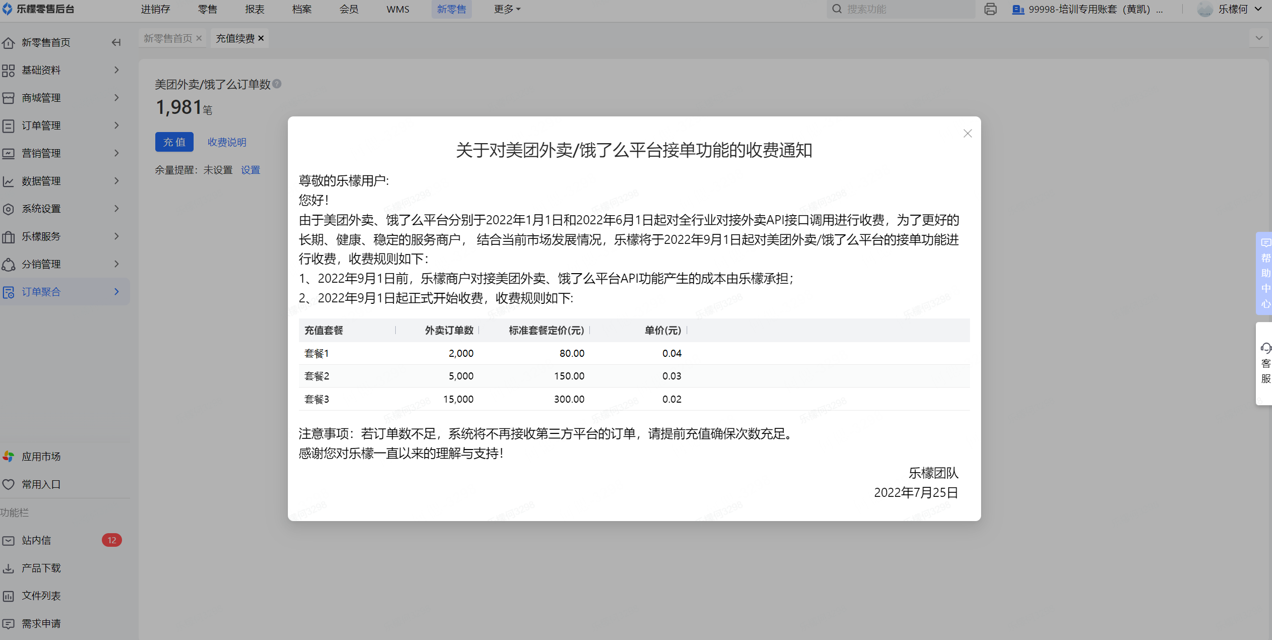 1.👉【操作路径】:1.登录后台进入新零售模块 - 2.点击订单聚合 - 3.点击充值续费