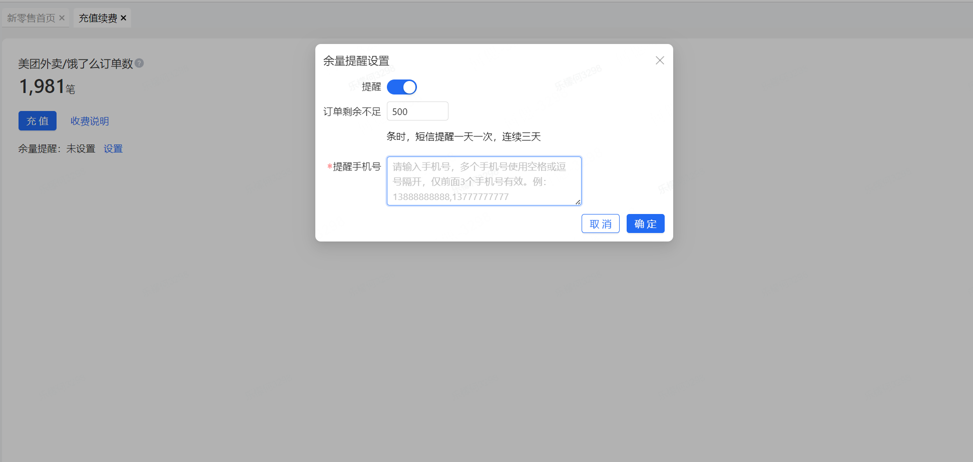 3.余量提醒(可设置提醒手机号以及订单剩余次数,不够时可短信提醒到对应手机号)