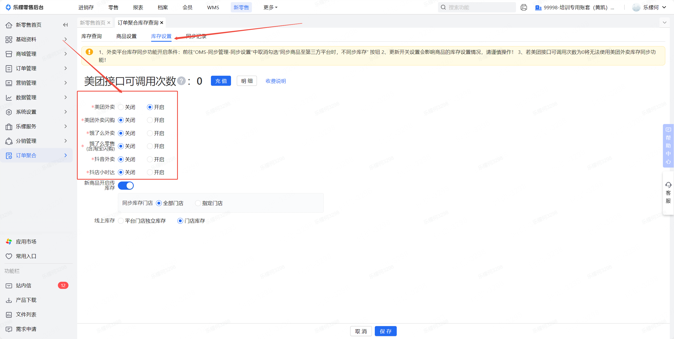 注:目前因美团外卖平台限制,在对美团外卖进行库存同步时需要收取API接口费用,若有同步美团外卖平台,需进行充值接口次数,充值后可正常使用库存同步,其他平台暂不收取
