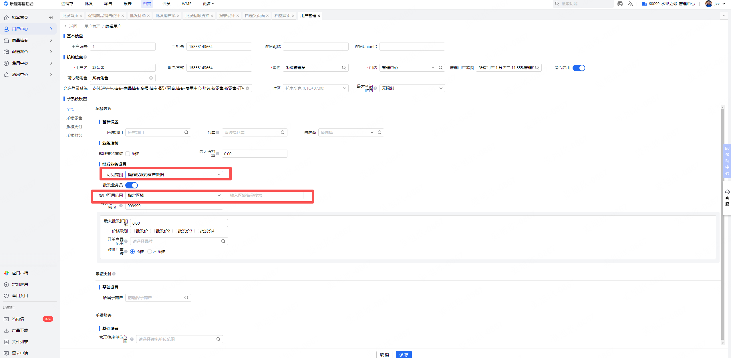 1、批发用户设置可见范围选择“客户管理区域内客户数据”,客户可用范围选择“指定区域”, 用户的数据可见性需要按照选择的客户区域来控制