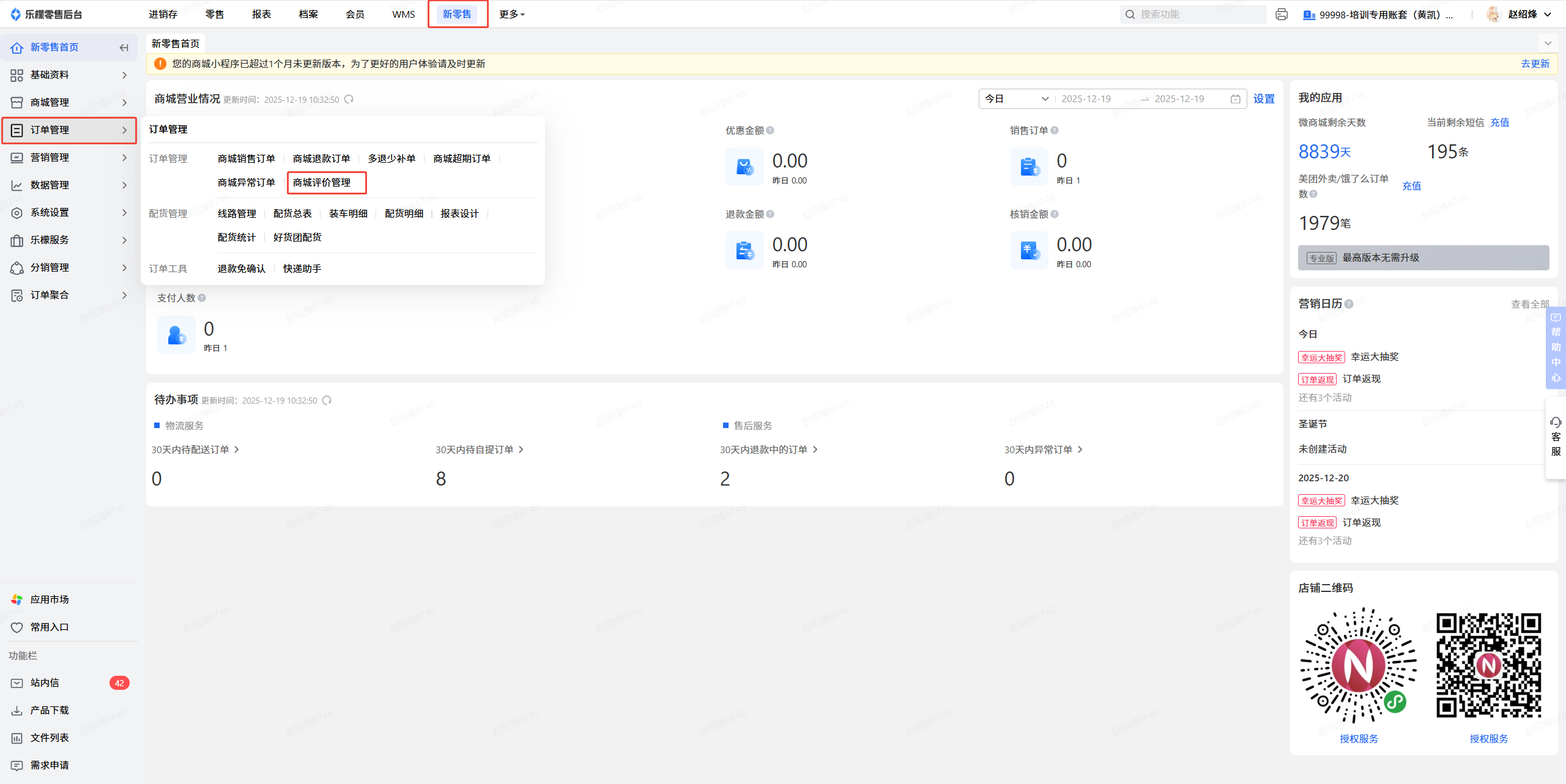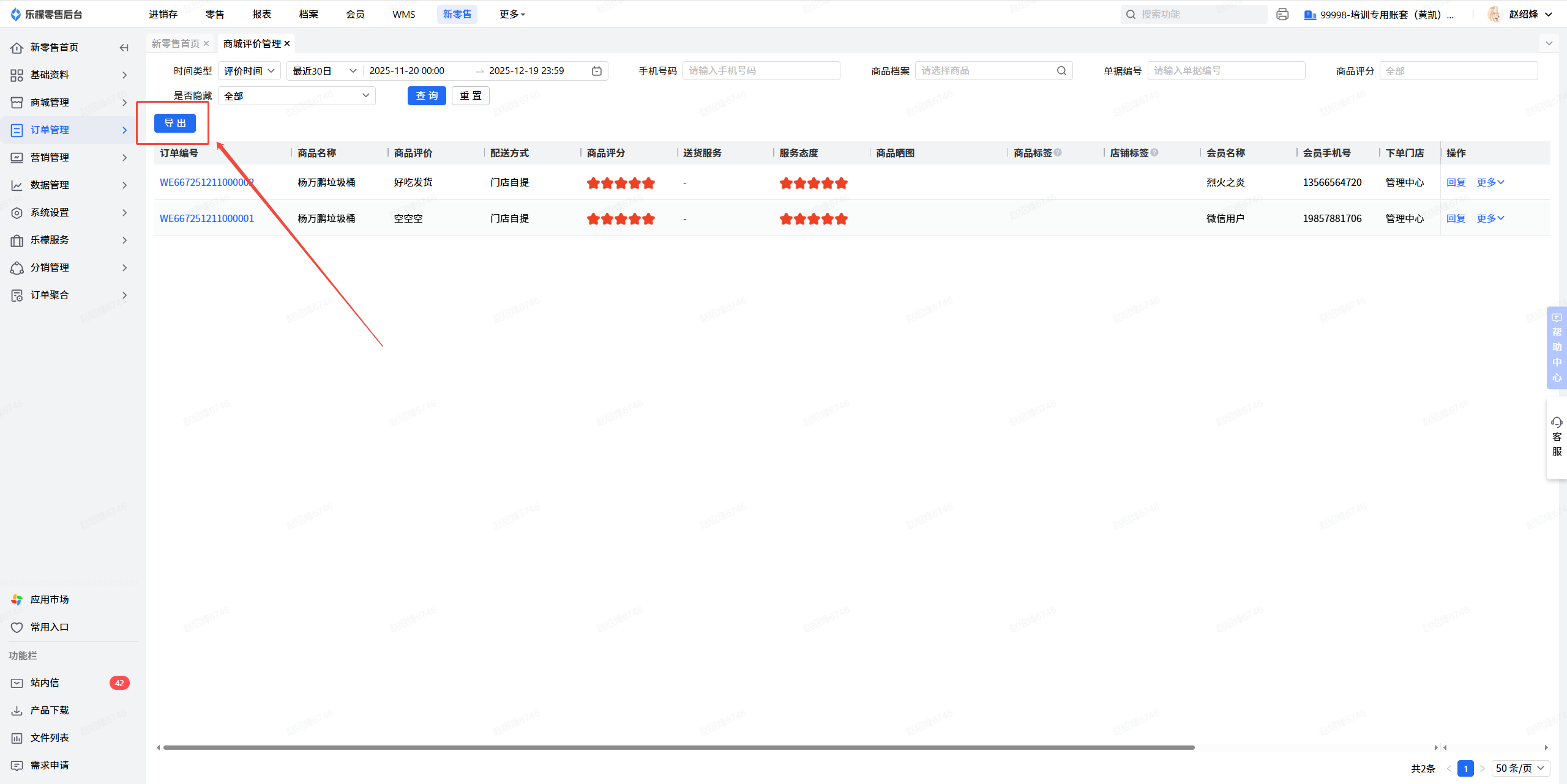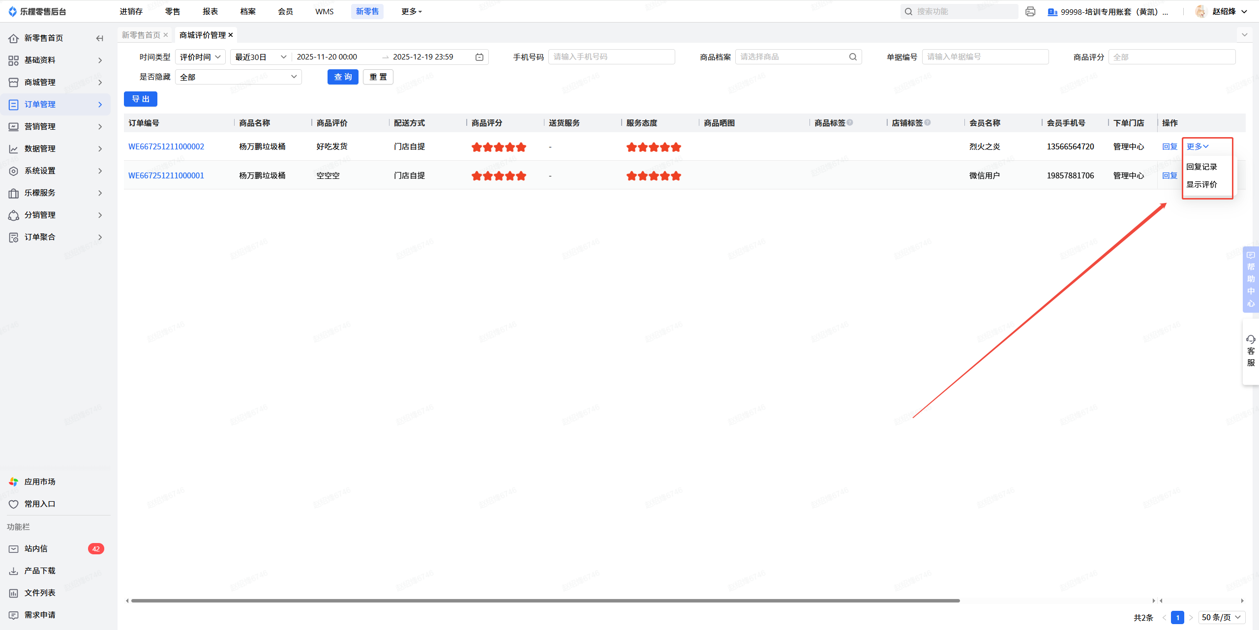 👉【操作路径】:1.登录乐檬零售后台 - 2.进入新零售模块 - 3.订单管理 - 4.商城评价管理