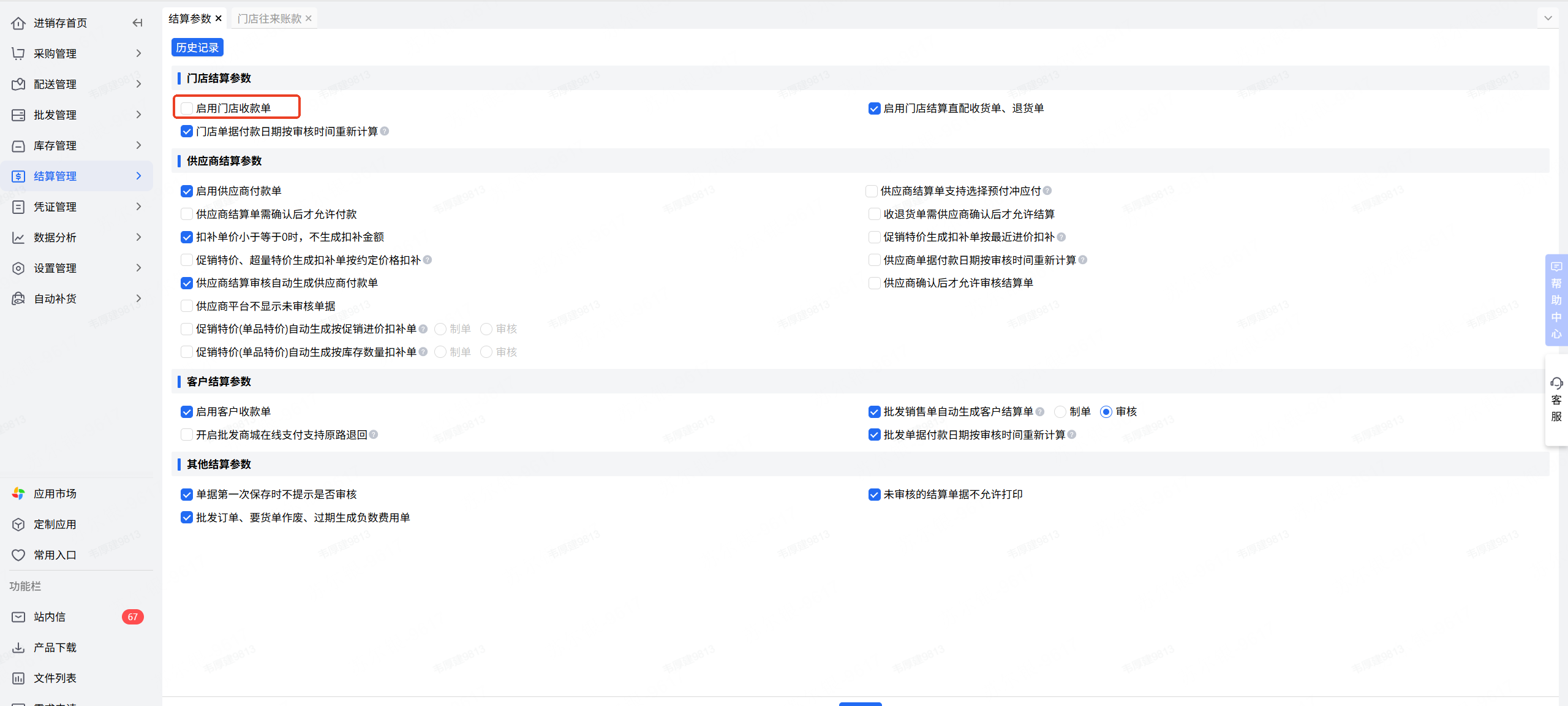 查看对应数据时,需要注意。进销存-结算管理-结算参数-启用门店收款单 参数是否有开启