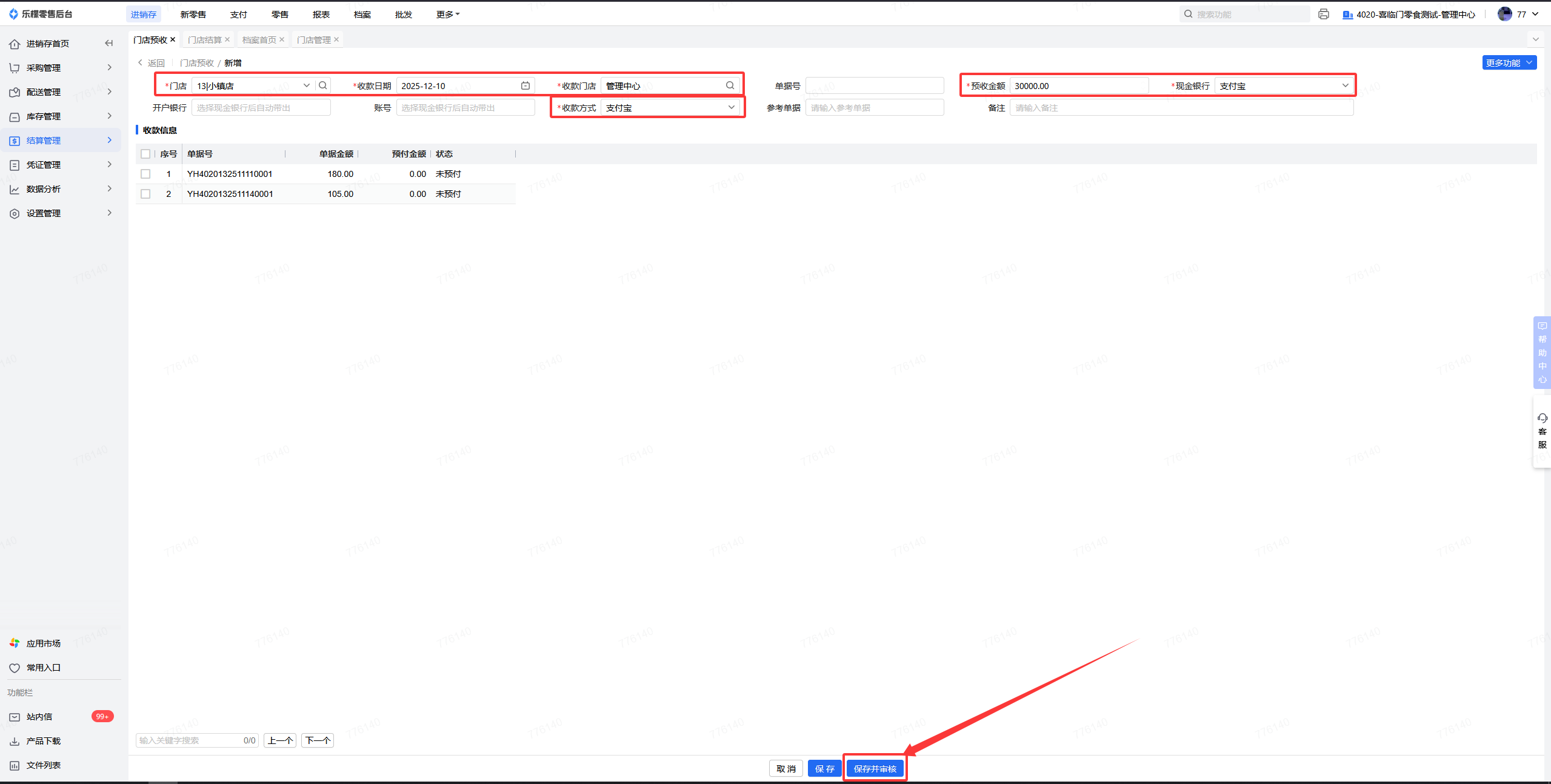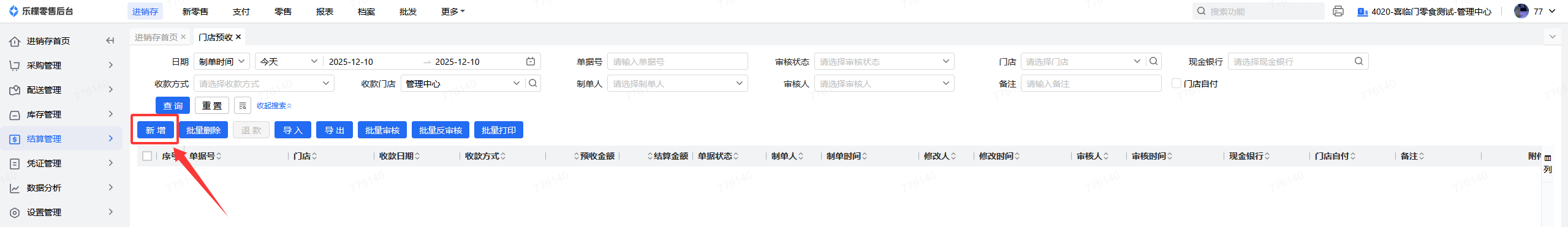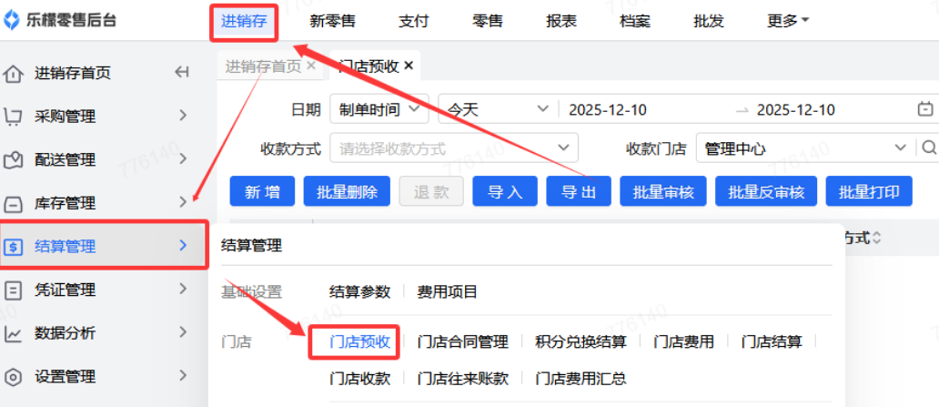 👉【操作路径】:1.进销存-结算管理-门店预收