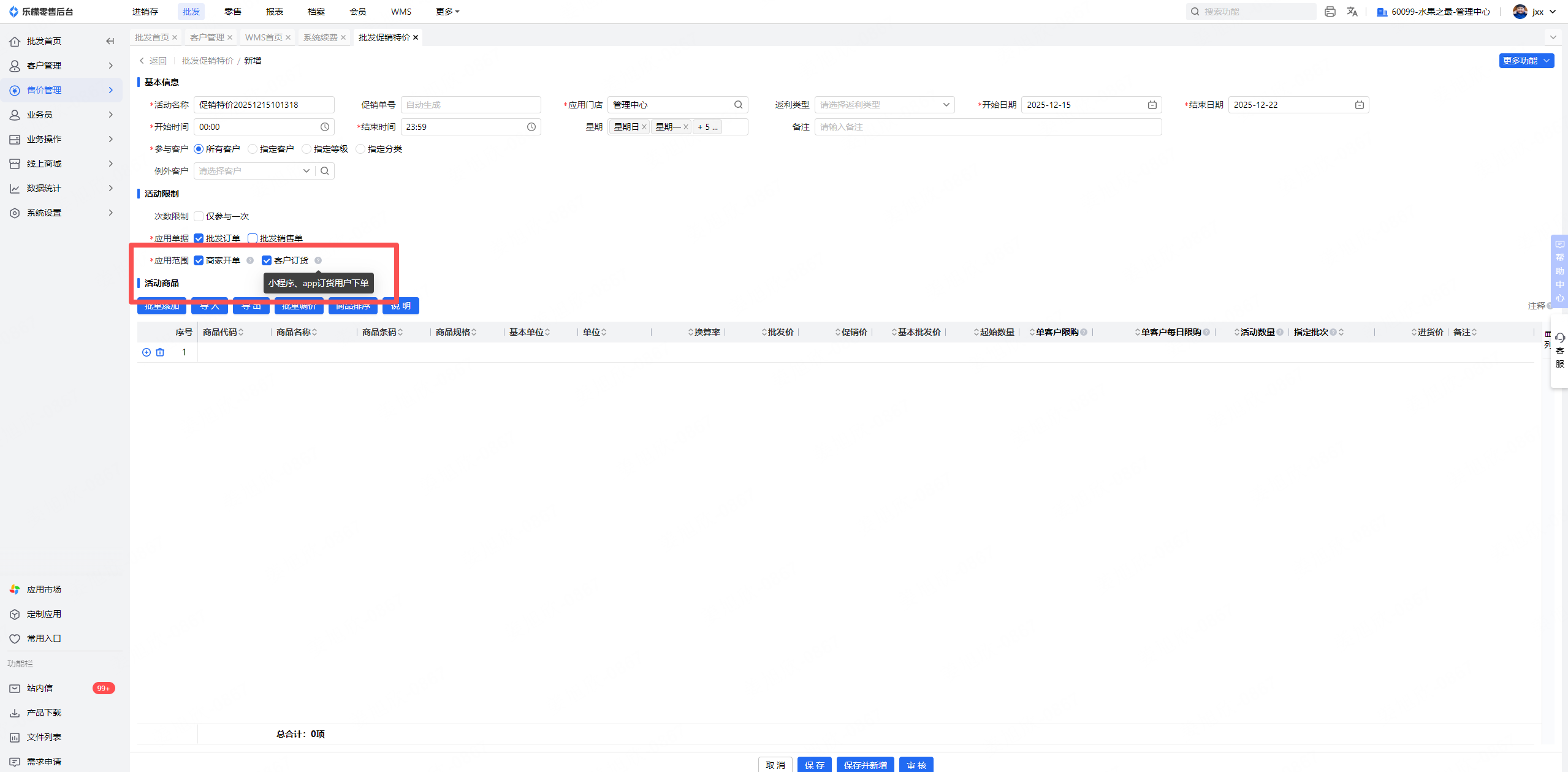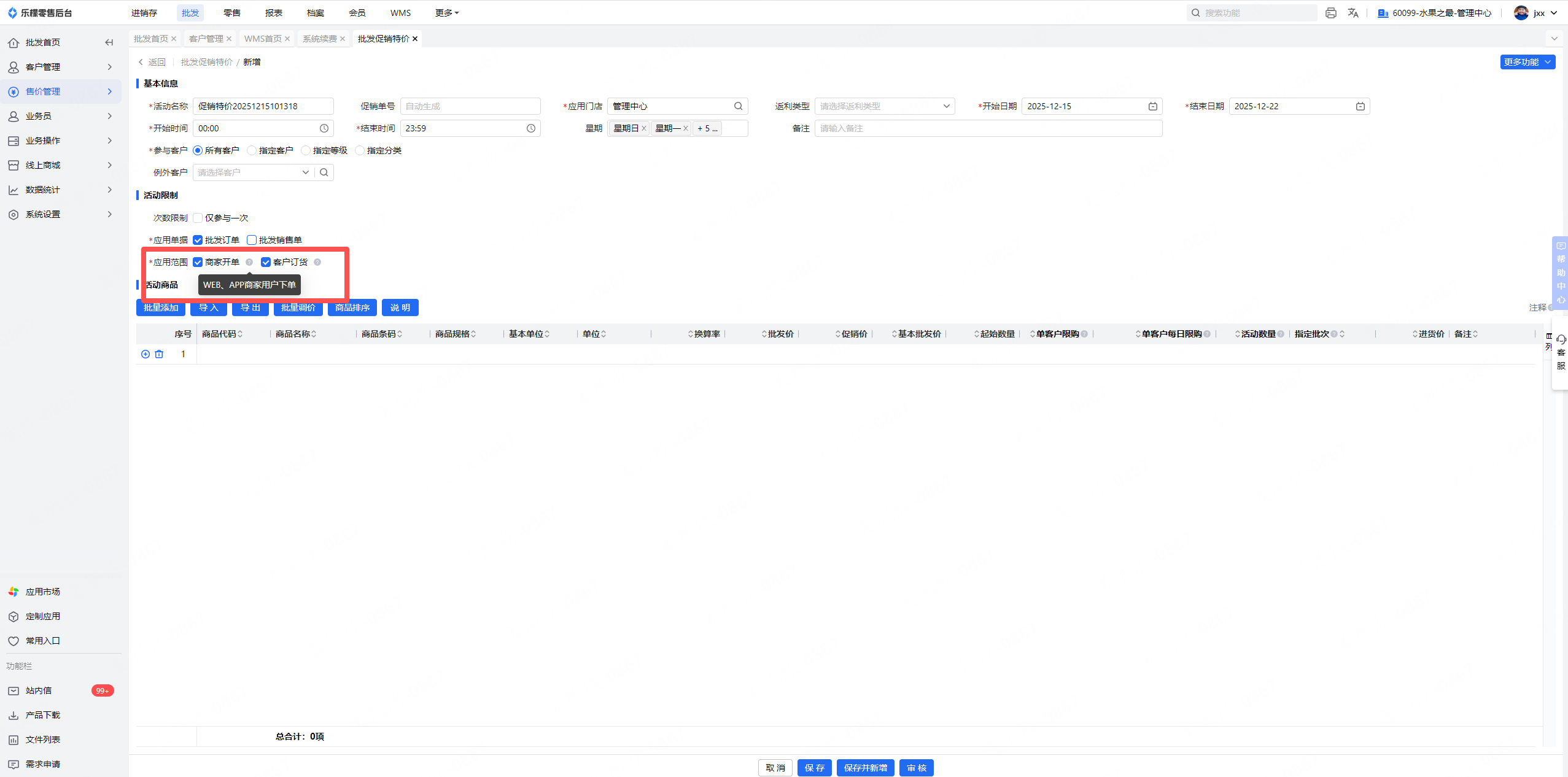 总部在规划批发促销活动时,希望根据对应的活动设置对应的应用范围