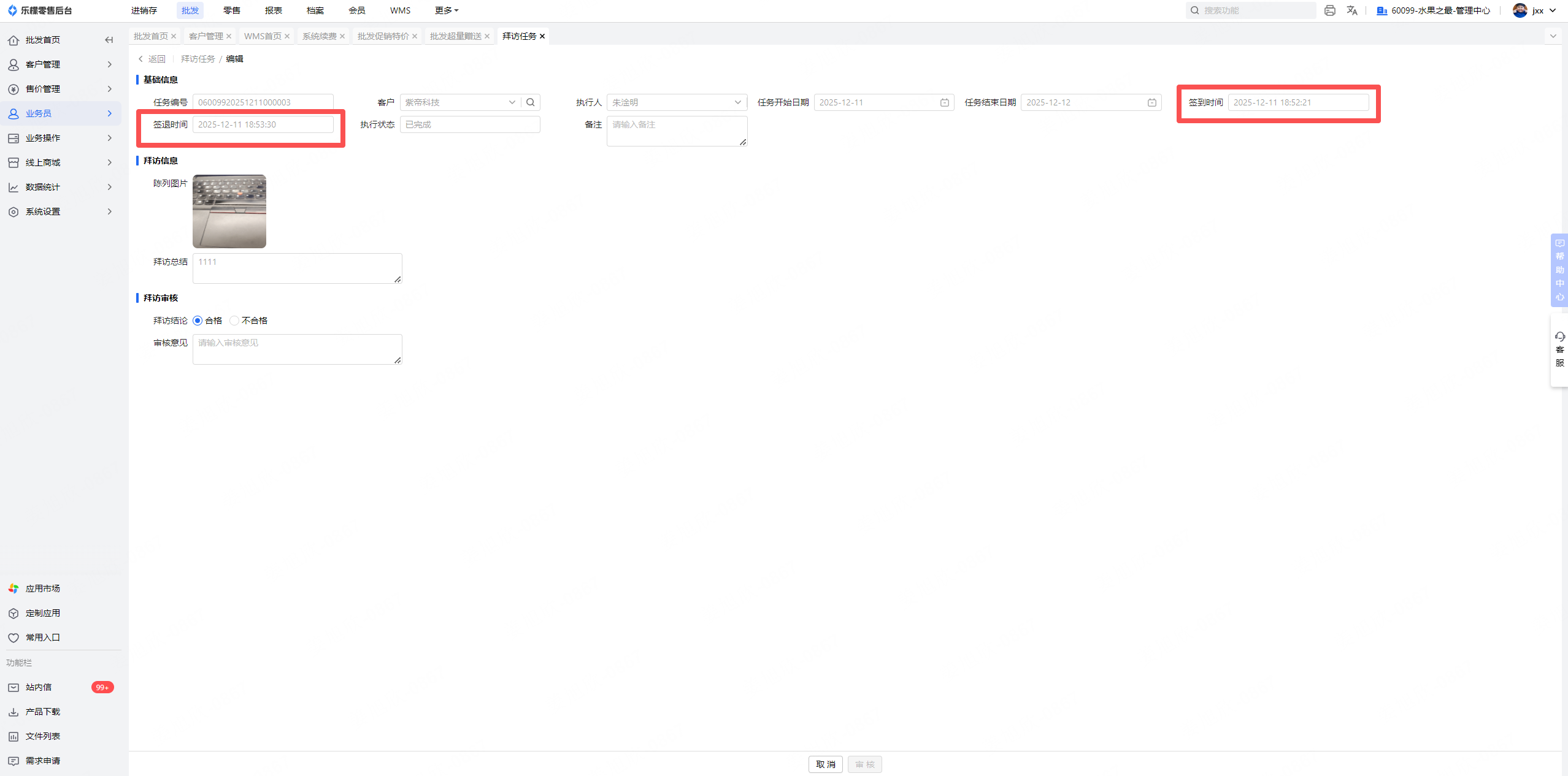 1、拜访任务详情:“执行时间”改名为“签退时间”,新增一个“签到时间”,根据用户app签到时间带入