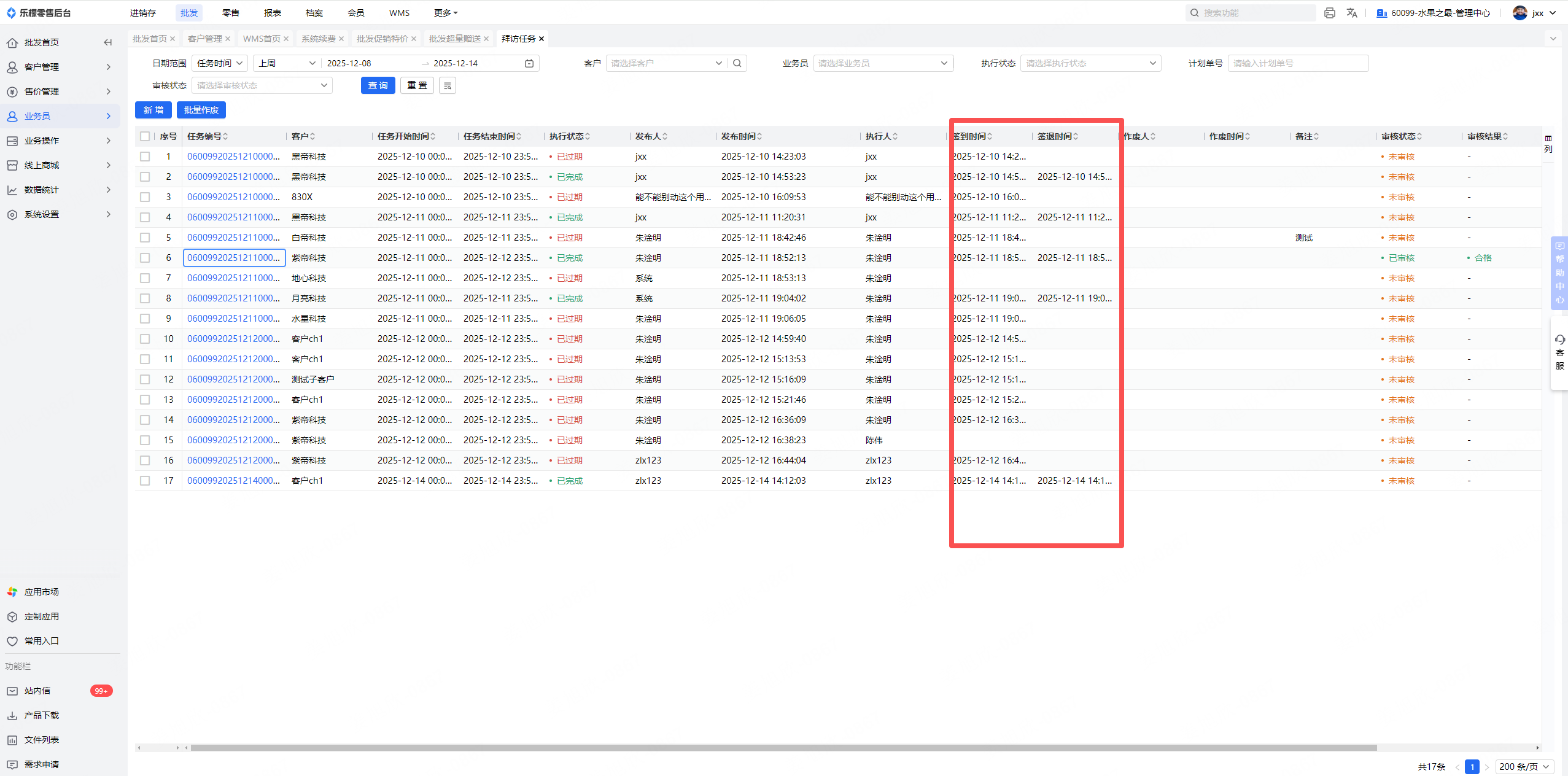 2、拜访任务列表:执行时间改为签退时间;新增一列“签到时间”;日期范围新增一个枚举值“签到时间”,“执行时间”改为“签退时间”