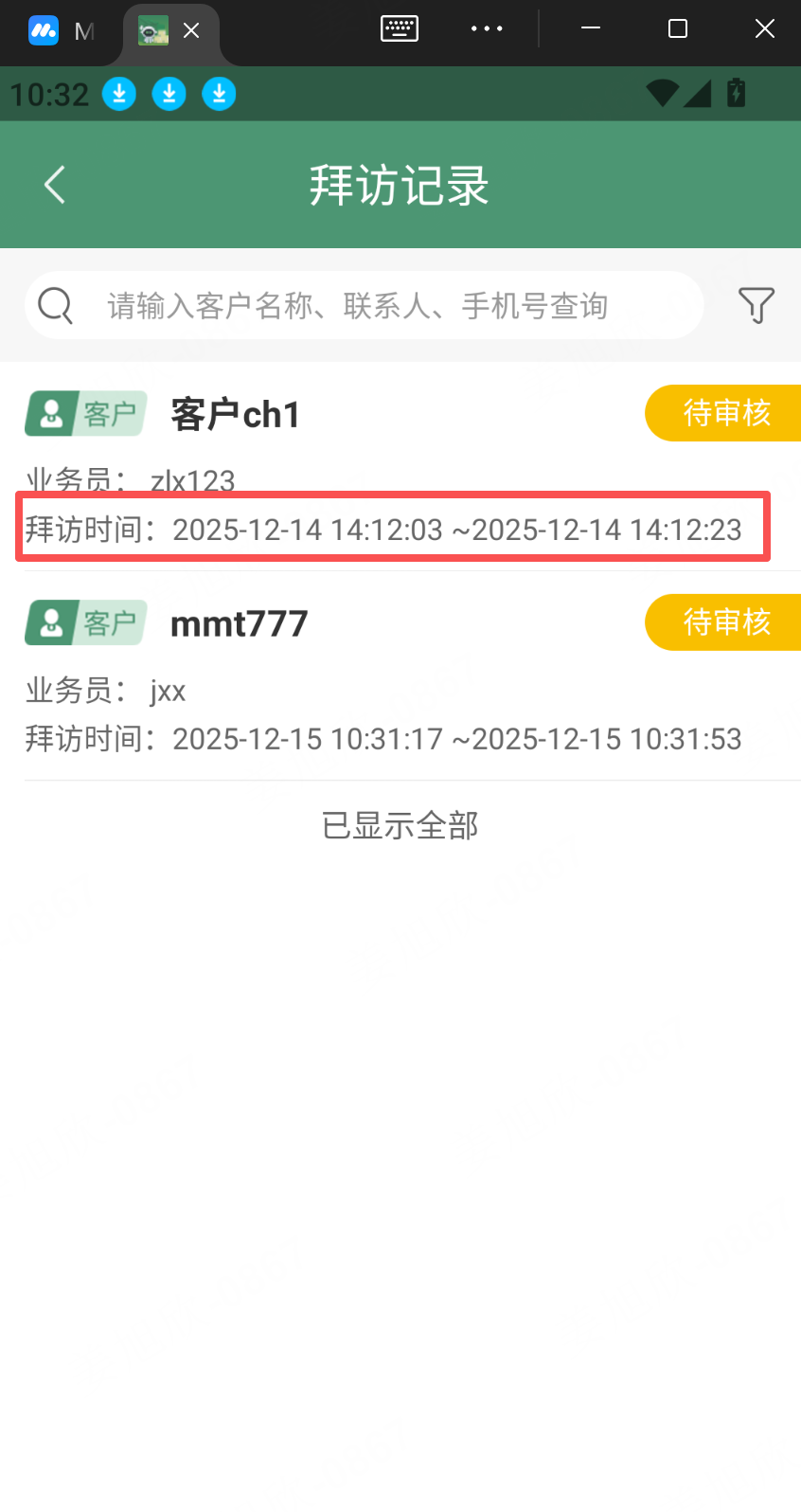 2、拜访记录列表:拜访时间需要展示签到时间-签退时间