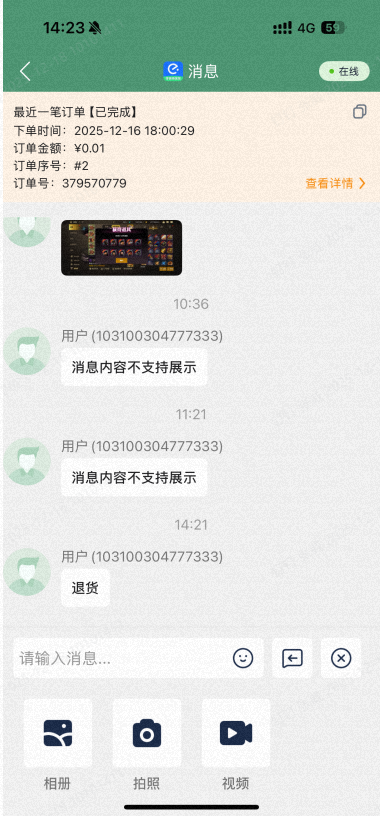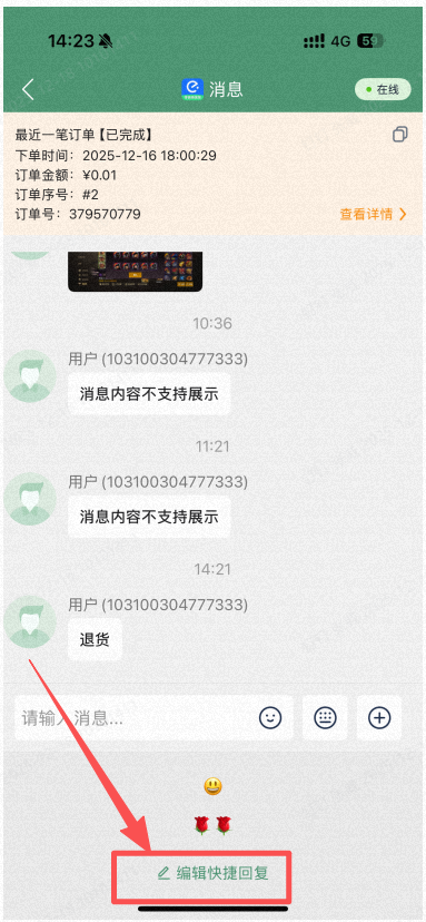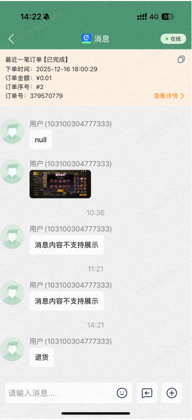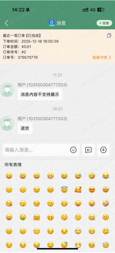 在消息内容中可快速查看该用户最后一次的订单,可快速跳转到订单详情进行处理。可复制订单信息提交给运营处理。
